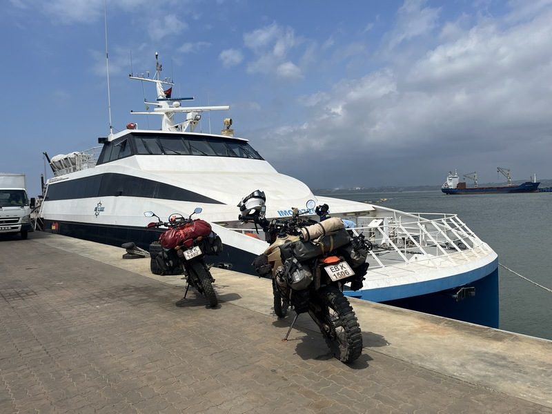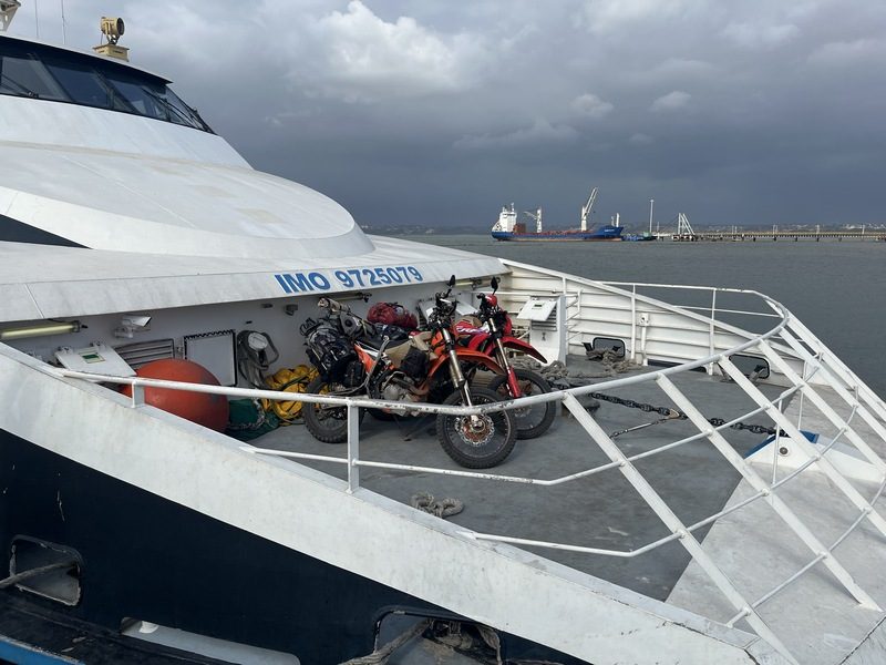 Unsere Motorräder wurden mit einem Kran an Bord des Katamarans gehoben, während wir an jeder Ecke wieder Passkopien abgeben und registrieren mussten. Da Motorräder selten an Bord der Passagierfähre reisen, gab es nur ein paar Schnüre zum Sichern und Jan ist mit einem Mann von der Crew nochmal auf den Bug geklettert, um mit unseren für genau solche Fälle mitreisenden Ratschengurten die Motorräder seefest zu verzurren. Dann ging es los.