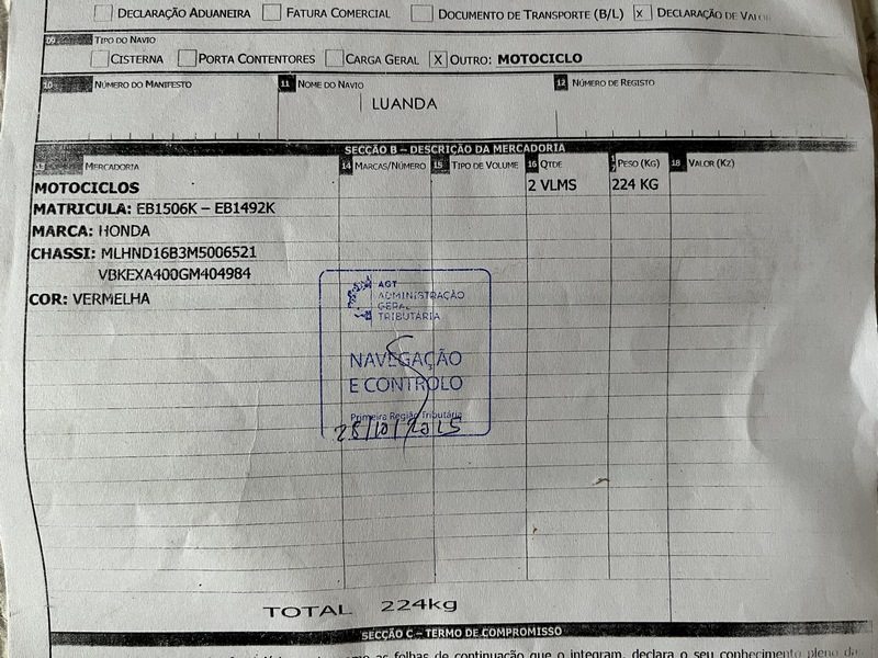 Die Fähre, die Cabinda täglich mit dem Rest von Angola verbindet, ist eine reine Personenfähre, die aber Motorräder als Fracht transportieren kann. Weil in Afrika ein Motorrad mit 650ccm schon ein unmöglich großer Panzer ist, geht die Preistabelle auch nur bis 650ccm. Und da 95% der Reisenden Motorräder fahren, die doppelt so groß sind, sorgt diese Fähre immer für heiße Diskussionen unter Afrikareisenden, denn den doppelten Preis für doppelte Größe will kein vergleichsweise reicher, weißer Reisender zahlen… Wir haben damit keine Probleme, unsere Motorräder sind winzig, passen überall rein und drauf, kosten wenig in Unterhalt und Verschiffung. Der Preis für das Handling im Hafen wird nach Fahrzeuggewicht im Fahrzeugschein berechnet und weil die Leseleistung in Cabinda nur ausreichend ist, bekamen wir die Papiere für zwei Honda mit dem Gewicht zweier KTM und der Kubik der Honda ausgestellt. Billiger wären wir nie auf die andere Seite vom Kongo gekommen! Wobei „billig“ immer noch relativ ist: der „Spaß“ kostete uns 700$. Dollar deshalb, weil es einfach unmöglich ist, bei 55€ Ausgabelimit und auf 2 Auszahlungen pro Karte limitierten Geldautomaten bis zur Abfahrt genug Bargeld in angolanischen Kwanza zu besorgen. Für solche (und viele andere) Fälle braucht man auf Reisen immer eine solide Menge Bargeld in „harter Währung“.