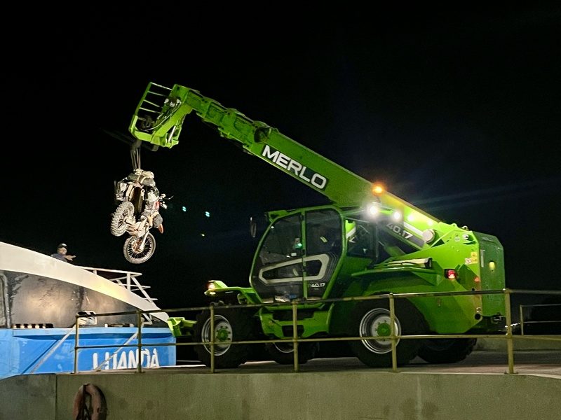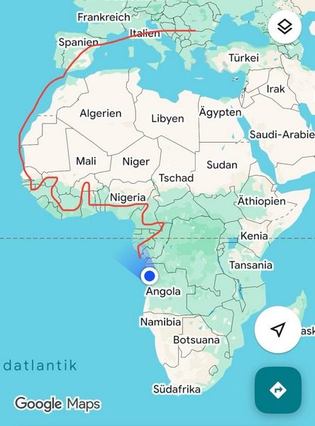 Wir hatten für 30€ die erste Klasse gebucht und bekamen Kotzetütchen, Sandwich und zwei Getränke serviert. Unsere Sitznachbarin drehte erst TikTok Musikvideos, dann schlief sie ein, während wir drei Stunden lang wild hin und her, hoch und runter geschaukelt wurden, denn die See war rau. Ich kannte die Bauart der Fähre von den Kapverden und weiß, dass sie dort für 4m hohe Wellen explizit bestellt wurden und hatte nur einmal einen kurzen Moment der „Konzentration“, als ich in der Toilette ein Waschbecken voll Erbrochenem aushalten musste, während ich andere Geschäfte zu erledigen hatte… Ansonsten sahen wir aus dem Fenster zu, wie die Fähre fast schon im Slalom um all die vielen Öl- und Gasbohrplattformen im Meer fuhr. Beide „Kongos“ und Angola haben hier ihre Öl- und Gasvorkommen dicht an dicht. In Soyo angekommen, mussten wir wieder (Stichwort Kontrolle, Bürokratie, Misstrauen,…) zur Immigration, „damit die wissen, dass Ihr da seid“. Alle mussten das. Und erst, als wir das hinter uns hatten und die Frage danach 3x bejaht haten, durften wir zu den Motorrädern, die gerade mit einem Kran abgeladen wurden. Ziemlich schaukelig mit nur einem „Bauchgurt“, aber sie kamen heil und salzig an. Schnell ins „Hotel Licy“ um die Ecke, in dem der Inhaber sich völlig sicher war, dass wir mit unseren Motorrädern die 420km bis Luanda in „höchstens 2,5 Stunden“ schaffen. Es gab schon wieder eine heiße Dusche und schon wieder Pommes – wir sind tatsächlich in „Zivilisation und Luxus“ in Angola angekommen!