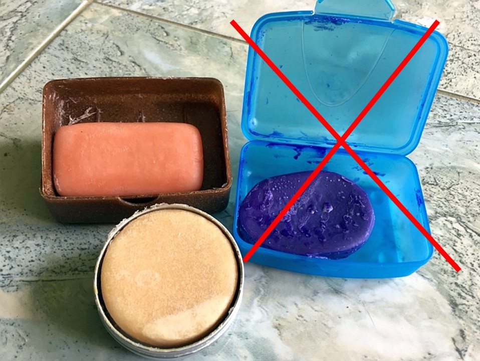 Dabei weiß ich es doch so viel besser! Auf dem Foto ist alles, was auslaufen kann, schwer ist und großes Packmaß hat als feste Variante zu sehen: das gute alte Stück Seife statt Duschgel, ein Stück Haarseife oder festes Haarshampoo (gibt es in jedem Bioladen und jedem Drogeriemarkt, nicht zu verwechseln mit Haarseife!) und ein Stück feste Haarspülung. Mit Glück kann man die unterwegs in Bioläden (Russland) oder Naturkosmetikshops (Armenien) oder europäischen Supermarktketten (Afrika) nachkaufen. Shampoo und Spülung sind super ergiebig! Das Foto zeigt das Shampoo in der Blechdose nach 1 Monat Gebrauch. Die Seife nutzen wir beide und sind da nicht wirklich wählerisch, was den Duft anbelangt. Sauber macht sie so oder so! Update 3/2019: Die feste Spülung ist aussortiert, die ist toll, wenn man im Auto reist, aber beim Motorradfahren werden die unterm Helm rausragenden Haare doch so strapaziert, dass die Pflegewirkung der festen Spülung nicht ausreicht. Ich suche noch nach Alternativen und reise bis dato mit einer pastösen Haarkur in der Tube und zwei Plastiktüten darum weiter.