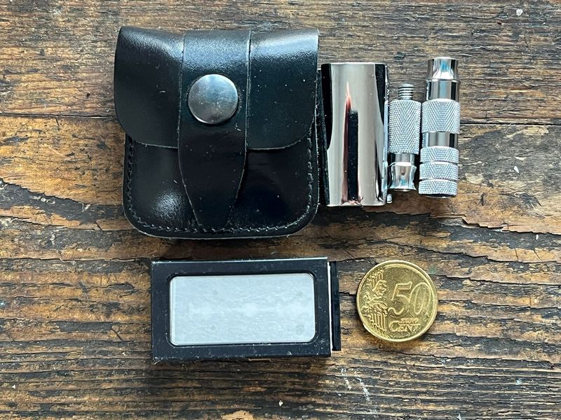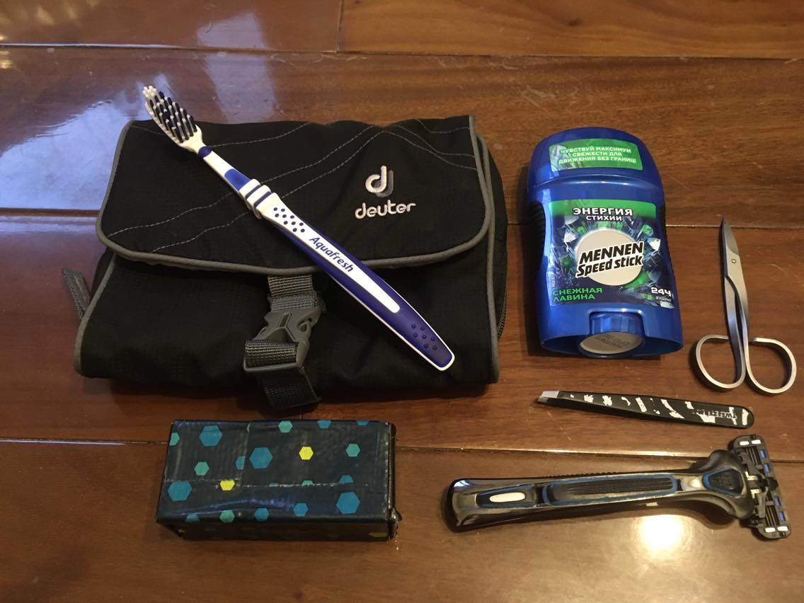 Jans „Badzubehör“  ist noch übersichtlicher, da er weder Haarspangen, noch Bürste oder Gesichtscreme nimmt. Auch er kennt explodierende Deoroller und Geschichten von „expandierendem“ Rasierschaum im Gepäck, sodass auch er Deostick und Rasierseife nimmt, statt voluminöse und explosionsgefährdete Dosen. Wir teilen Zahnputztabletten (ein Ersatzbeutel ist tief im Gepäck verstaut), Zahnseide, Nagelschere, Pinzette, Sonnencreme und Seife. Das reicht für zwei und wandert von einem zum anderen Kulturbeutel.