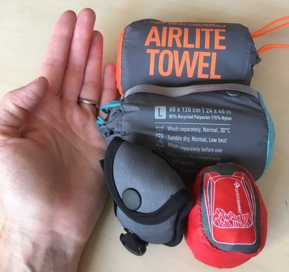 Update 9/2022: Die Welt dreht sich weiter und es gibt neue Produkte auf dem Markt! Auf dem obigen Foto seht Ihr zwei riesige Handtücher (60x120cm), einen Rucksack und eine Wäscheleine mit „Klammern“. 🙂 Ich habe das Hautgefühl von Microfaser, mit denen wir bis 2022 unterwegs waren, immer gehasst und bin daher im Outdoorladen in Sofia auf das neue Handtuchmaterial von Sea to Summit gestoßen: Haptik super (wie ein Leinentuch), und als dann noch die Verkäuferin mit dem Packmaß (siehe oben: 4,7×2,4cm, 67g) um die Ecke kam, war es um uns beide geschehen. Es geht tatsächlich noch kleiner, leichter und schnelltrocknender als Microfaser! Das alte Microfaserhandtuch war außerdem zu klein, um mich darin einzuhüllen. Mit 120x60cm ist das neue Wunderding groß genug, um damit gut bedeckt vom Zimmer zur Gemeinschaftsdusche zu huschen. Es saugt auch wesentlich besser und trocknet ratzfatz!