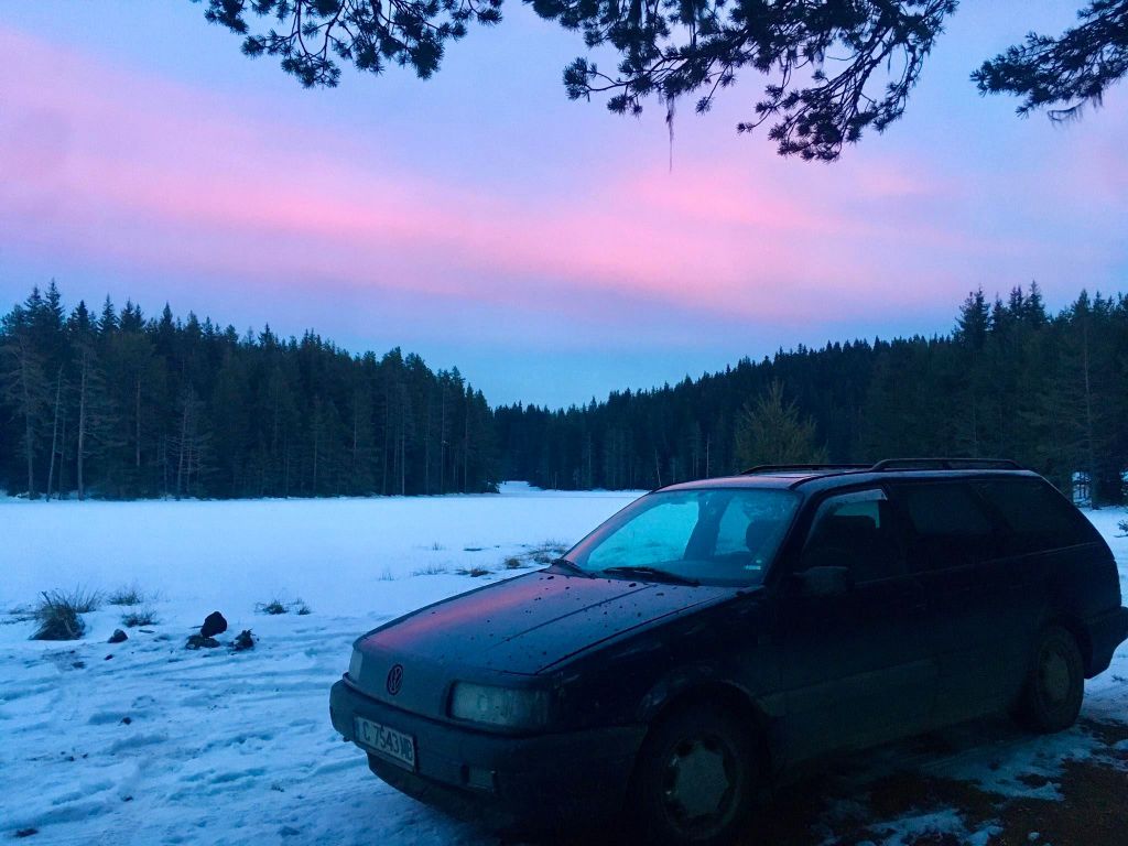 Da wir nun nicht in der Hütte übernachteten (denn das vorhandene Brennholz ist nur für Notfälle, wer geplant kommt muss eigenes Holz bringen), mussten wir einen Stellplatz für Hans und Eule suchen. Im Winter ist das schwierig, wenn so viel Schnee liegt, das vergessen viele angehende „Vanlifer“. Auch ein Allradfahrzeug schieb sich nach ein paar Metern einen Schneeblock unter das Auto, der ein Vorwärtskommen unmöglich macht. Woher ich das weiß? Aus Erfahrung mit einem Landrover Defender… Auf Buddeln hatten wir keine Lust, aber wir fanden einen Waldweg, der wegen dichter Bäume nur mäßig beschneit war. Leider war es schon fast dunkel als wir ankamen und wir hatten etwas Stress, denn wir vier nehmen seit Januar zwei Mal wöchentlich online an einem Bulgarischkurs teil. Und das lassen wir natürlich nicht ausfallen, nur weil wir ins Auto gezogen sind! Ich glaube, wir waren die ersten „Waldschüler“ auf der bulgarischen Lernplattform. 😊