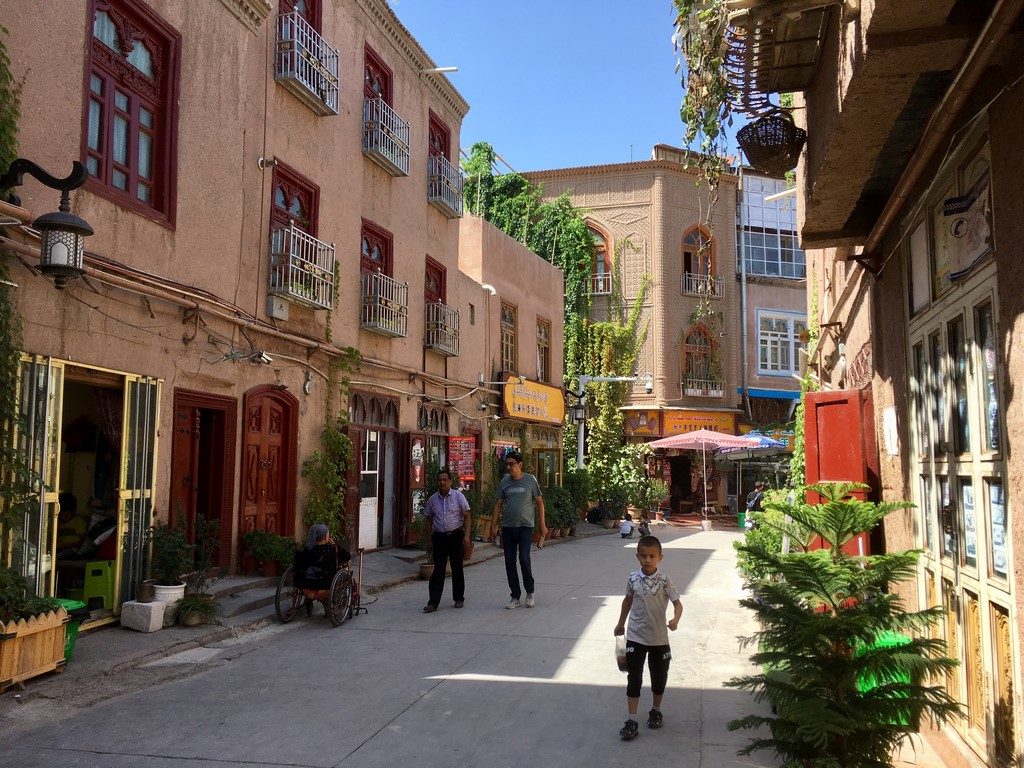 Kashgar selbst ist eine nette Stadt. Es hat 2 Tage gedauert, bis ich wusste, warum sie sich für mich nicht nach dem China angefühlt hat, was ich von 2014 kannte: es fehlt der Lärm und Gestank tausender knatternder Roller und Mofas! Die Straßen sind hier voll von Rollern, die aber allesamt lautlos mit Elektromotoren rollen! Die Fahrradwege sind breit, durch Barrieren von der Autostraße und nach Fahrtrichtungen getrennt. Und auf diesen Fahrradwegen rollen Fahrräder und Elektroroller friedlich miteinander laut- und geruchslos durch die Stadt.