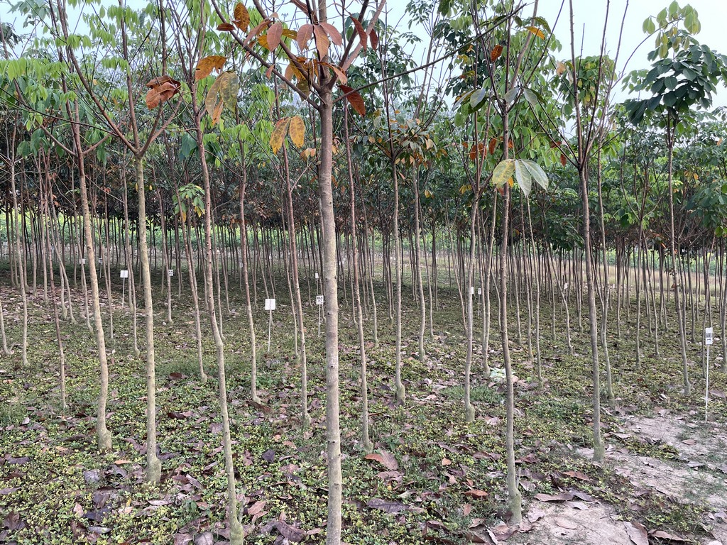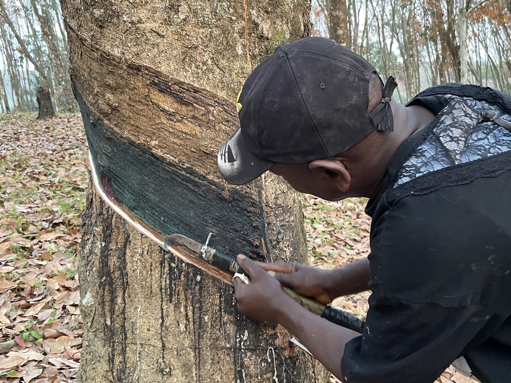 Die Plantage kauft zu 20% auch von lokalen Farmern Kautschuk an und verkauft ihnen auch die Jungpflanzen. Hauptsächlich solche, die besonders schnell hohen Ertrag liefern, um die Farmer zu motivieren. Langfristige Planung ist in Afrika recht unbekannt. Kautschukbäume sind Klone, sie werden nicht aus Samen gezogen, sondern aus Stecklingen, die auf einen guten Wurzelstock aufgepfropft werden. Weil das eine Arbeit ist, bei der viel Sorgfalt nötig ist, werden hauptsächlich Frauen dafür ausgebildet, die wir laut schnatternd bei aufgehender Sonne dabei sahen, wie sie sich um die Jungpflanzen kümmern.