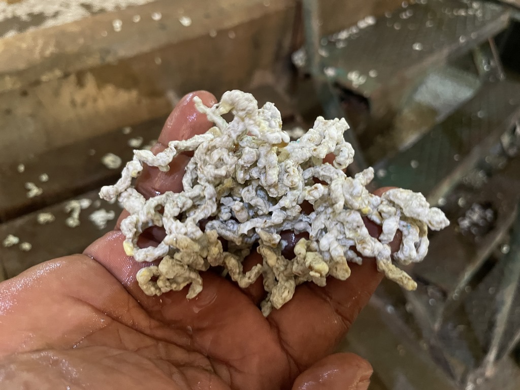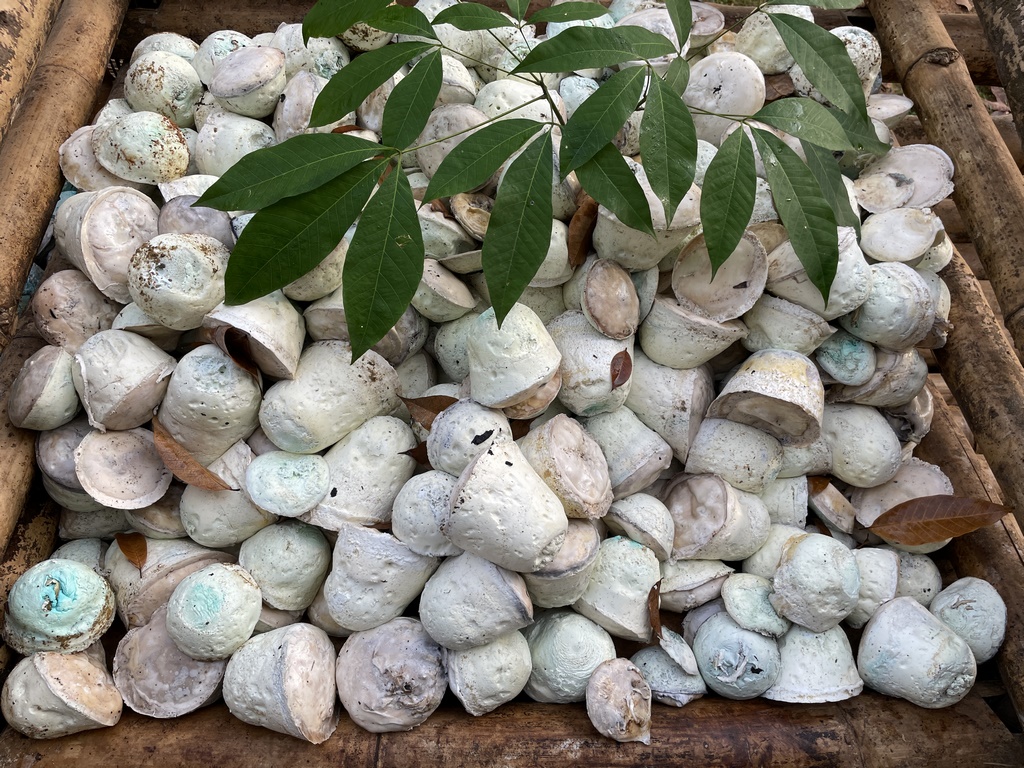 In den Bechern befindet sich jeweils ein Tropfen Farbe und ein Tropfen (Ameisen- oder Essig-) Säure. Die Farbe verhindert, dass geklauter Latex an die Firma verkauft werden kann und die Säure führt dazu, dass der Saft fest wird. Im Prinzip wie bei Lab und Käse. Auch geruchlich kommt der Vergleich hin: der Latex riecht nach Rohmilchkäse und ist auch so weiß. Nach einer gewissen Zeit, abhängig vom Alter des Baumes, der Sorte und Jahreszeit, hört das Tropfen auf und die Latexbällchen werden eingesammelt und auf Holzgestellen bis zum Abtransport gelagert. Dort tropft weiterhin Flüssigkeit aus dem Latexbällchen – exakt wie bei der Herstellung von Käse.