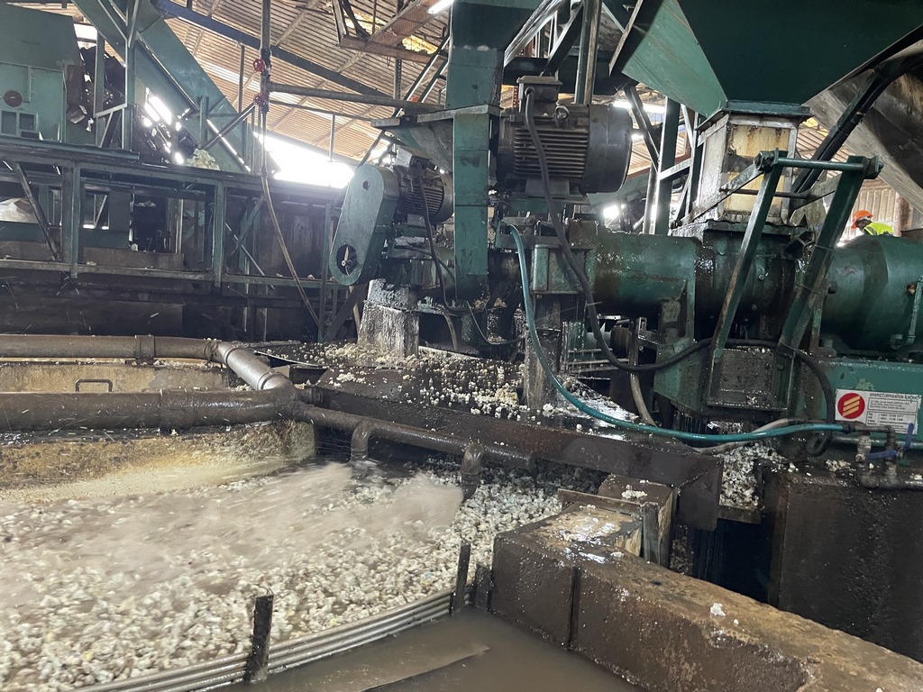 Zunächst wird aufwändig gewaschen. Es darf kein Schmutz, keine Erde, kein Sand vorhanden sein. Dazu werden die Latexbällchen in mehreren Waschgängen gespült und in immer kleinere Stücke geschnitten. Per Hand werden auf Fließbändern etwaige Fremdbestandteile wie Plastik von zerbrochenen Bechern oder Transportwannen aussortiert. Das Aussehen ändert sich dabei von Bällen zu Fetakäsebrocken zu Popcorn und letztendlich weißen Spätzle.