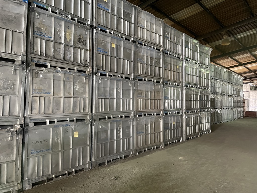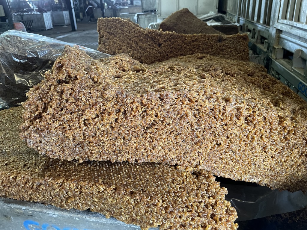 Ein solcher „Käselaib“ wiegt mindestens 15kg und sieht schon ein wenig nach „Schuhsole“ aus. Die „Käselaibe“ werden dann auf einer Waage zu 35kg abgewogen und in einer letzten Form zu einem dicken Block reinem Naturkautschuk zusammengepresst. Jeder Block wird per Hand nochmal kontrolliert und nochmal gewogen, bevor er verpackt wird. Je nach Kunde gibt es verschiedene Angaben an die Verpackung. Die europäischen Reifenhersteller wie Michelin oder Nokian nutzen riesige Mehrweg-Metallkisten, in die rund 1,3t Kautschukblöcke gestapelt werden. Die Mehrweg-Kisten schicken die Reifenhersteller dann zusammengefaltet wieder per Container zurück.