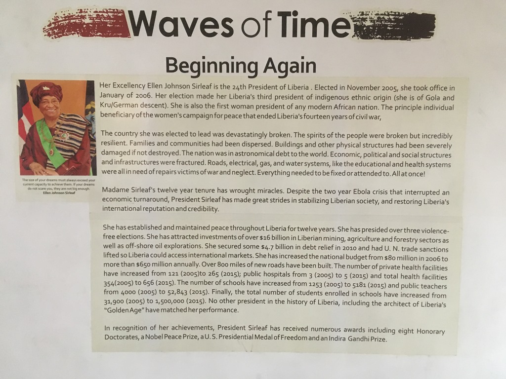 Die Liberianer haben das verstanden und später die erste afrikanische Präsidentin gewählt: Ellen Johnson Sirleaf. Sie durfte das Land buchstäblich „aufräumen“. In ihrer 15-jährigen Regierungszeit hat sie sogar den Erfolg der „goldenen Ära“ nach dem 2. Weltkrieg übertroffen, für politische Stabilität, Bildung, Gesundheit und Wirtschaftswachstum gesorgt. Ob es deswegen so außergewöhnlich sauber im Land ist? Noch hat Liberia einen langen Weg vor sich, aber wir spüren die positive Energie der Menschen, vorwärts kommen zu wollen. Mehr zum „Frieden durch Androhung von Striptease“ hier: https://de.m.wikipedia.org/wiki/Leymah_Gbowee