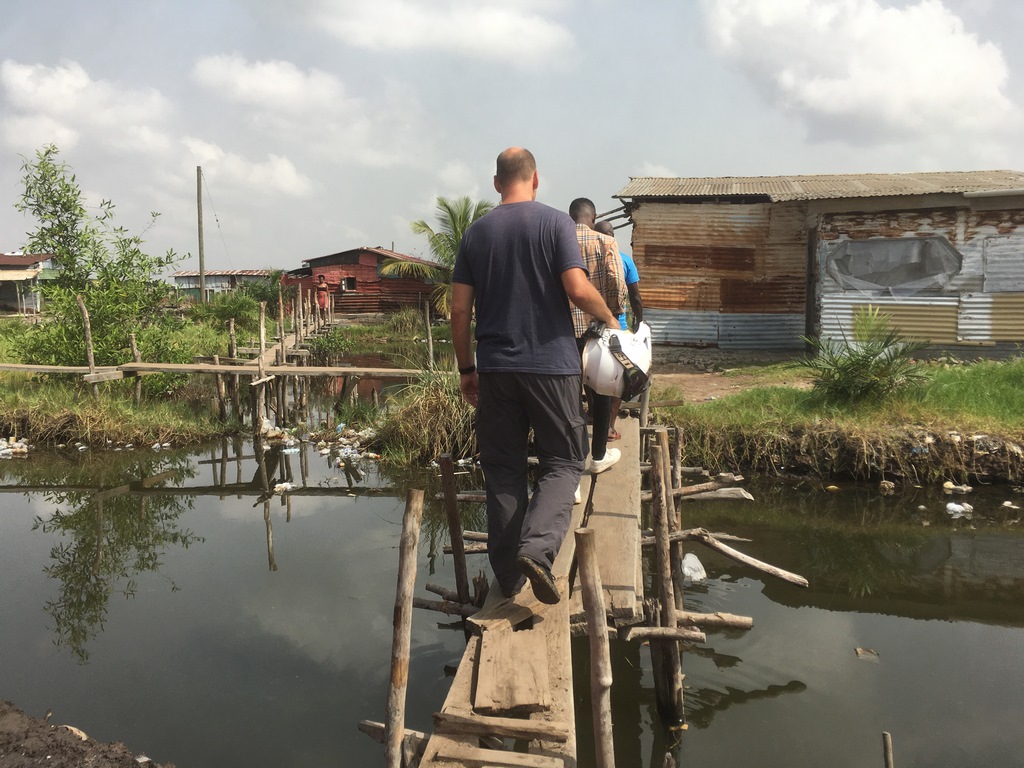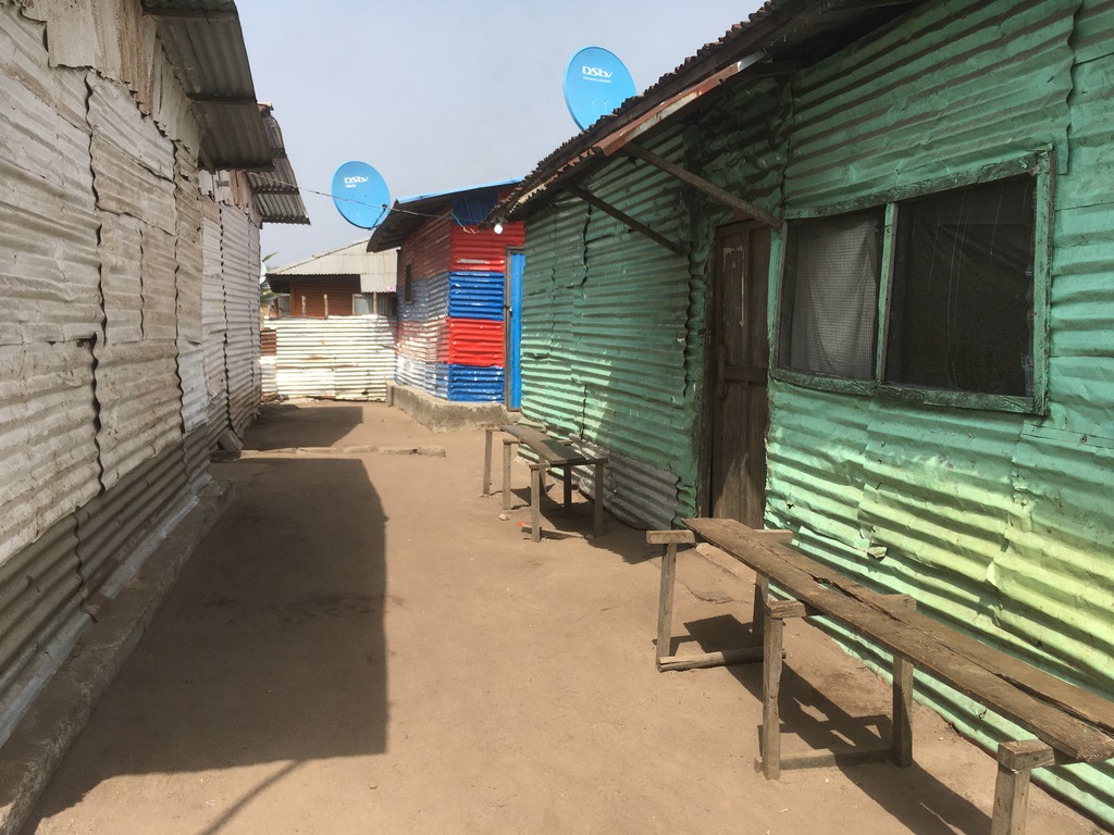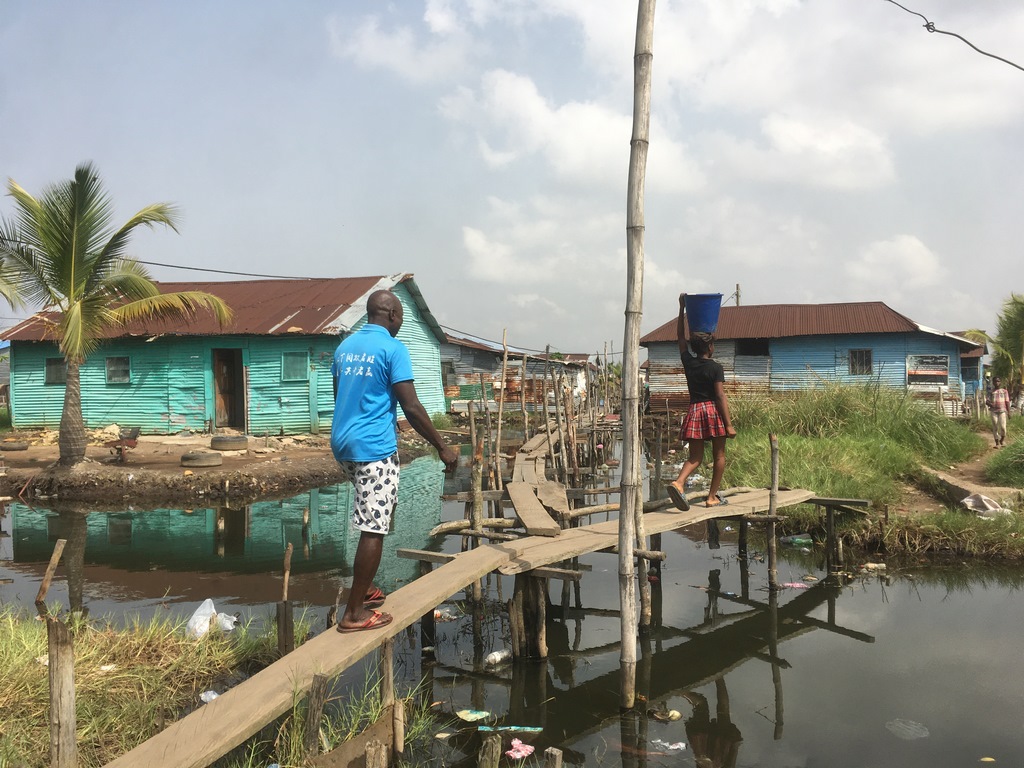 Über einen amerikanischen Motorradreisenden erfuhren wir von einem Stadtviertel Monrovias, das laut UN-Definition ein Slum ist: kein Zugang zu Trinkwasser, keine Stromversorgung, keine sanitären Einrichtungen, keine Eigentumsrechte. Als Tourist sollte man sich von Slums weltweit fernhalten, wir fuhren aber trotzdem hin. Das Viertel wurde in die Mangroven „hinter“ der Stadt gebaut und bis heute wird es immer mehr erweitert: die Menschen legen Kanäle an und bauen sich mit dem Aushub aus den Kanälen lauter kleine „Halligen“, auf denen sie ihre Blechhütten bauen. Der Klimawandel führt dazu, dass diese „Halligen“ immer weiter erhöht oder befestigt werden müssen, damit die Häuser und ihre Bewohner nicht mit den Füßen im Wasser stehen.