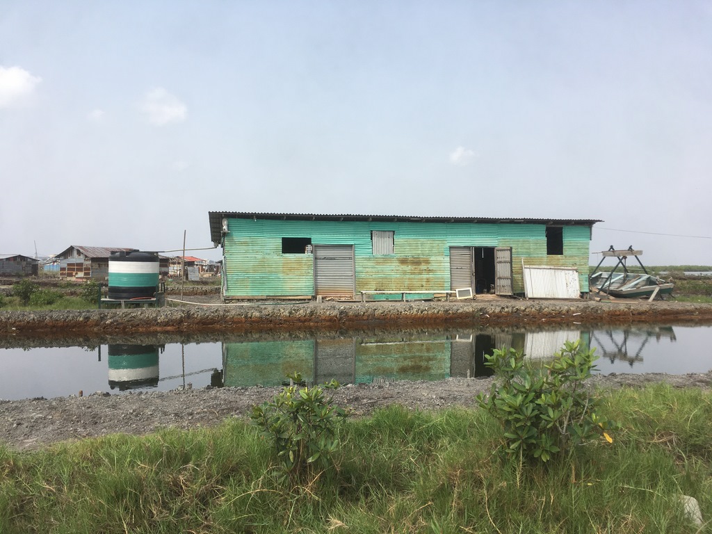 Weil die Wasserkanäle voll Abwasser sind und die Menschen erkannt haben, dass es nicht gesund ist, aus der Kloake Fische zu essen, hat sich die Gemeinschaft der dort lebenden Menschen eine Art Fischfarm gebaut: in den Boden der Mangroven wurden Becken gebuddelt, die mit benzinbetriebenen Pumpen mit Frischwasser aus der Lagune befüllt werden, um so für frischen Fisch für die Gemeinschaft zu sorgen. Wir waren beeindruckt! Der Fisch wird nicht verkauft, alle packen an, jeder darf Fisch essen, ein „Fischwart“ wird von allen unterstützt, soweit sie können. Im Viertel gibt es eine Kirche und eine Art Kneipe, aber keine Lädchen oder andere Dienstleistungen. Alles muss vom Festland herbeigetragen werden. Trotz ihrer schwierigen Wohnsituation bekamen wir erzählt, dass man auf dem Wasser viel besser lebe als in der Stadt: es geht ein leichter Wind und das viele Wasser kühlt. So kann man es auch sehen. Wieder ein Beispiel für die so positive Einstellung der Menschen in Liberia.