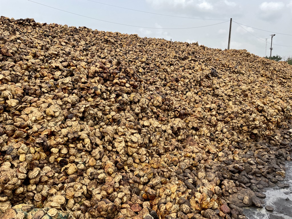 In der Fabrik werden dann die Latexbällchen (oder Ballen) weiter gelagert. Dabei wird in hohen Haufen gestapelt, um einerseits Druck auszuüben und mehr Flüssigkeit aus den Bällchen herauszupressen, andererseits verfärbt sich der Latex unter Sonneneinstrahlung und Hitze braun und altert. Je höher der Haufen, desto weniger Alterung und desto mehr Wasser tritt aus. Das Wasser wird aufgefangen und geklärt, bevor es über eine Lagune wieder der Natur zugeführt wird. Nach mindestens 21 Tagen sind die Latexbällchen genug abgetropft und können verarbeitet werden.