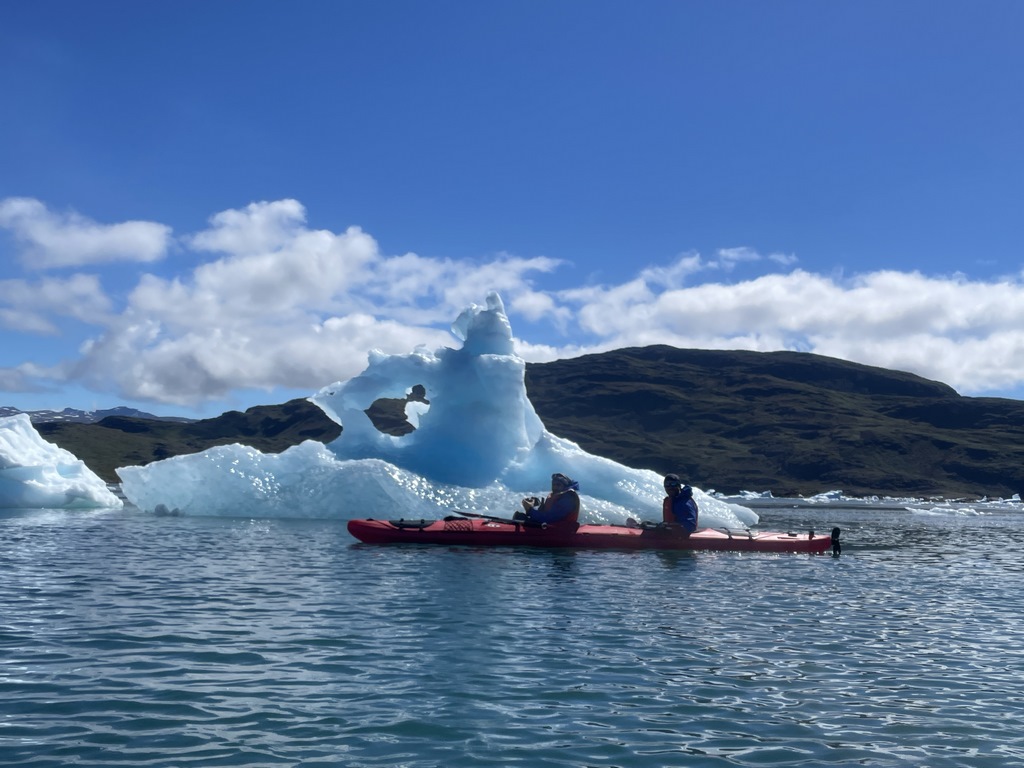 Manche Eisberge leuchten überall türkisgrün, andere nur stellenweise, manche sind schneeweiß und selten glitzern Eisberge kristallklar wie Glas in der Sonne. Anfangs hatten wir ziemlich Respekt, zwischen all dem knisternden Eis zu paddeln, denn manchmal brechen riesige Stücke Eis ab und sorgen für Wellen. Außerdem hat der Fjord eine Strömung und diese kann zwischen Eisbergen kräftig sein – oder zu Strudeln werden. Doch nach einer Weile des Paddelns und Beobachtens verflog die Skepsis und wir genossen das Erlebnis sehr.