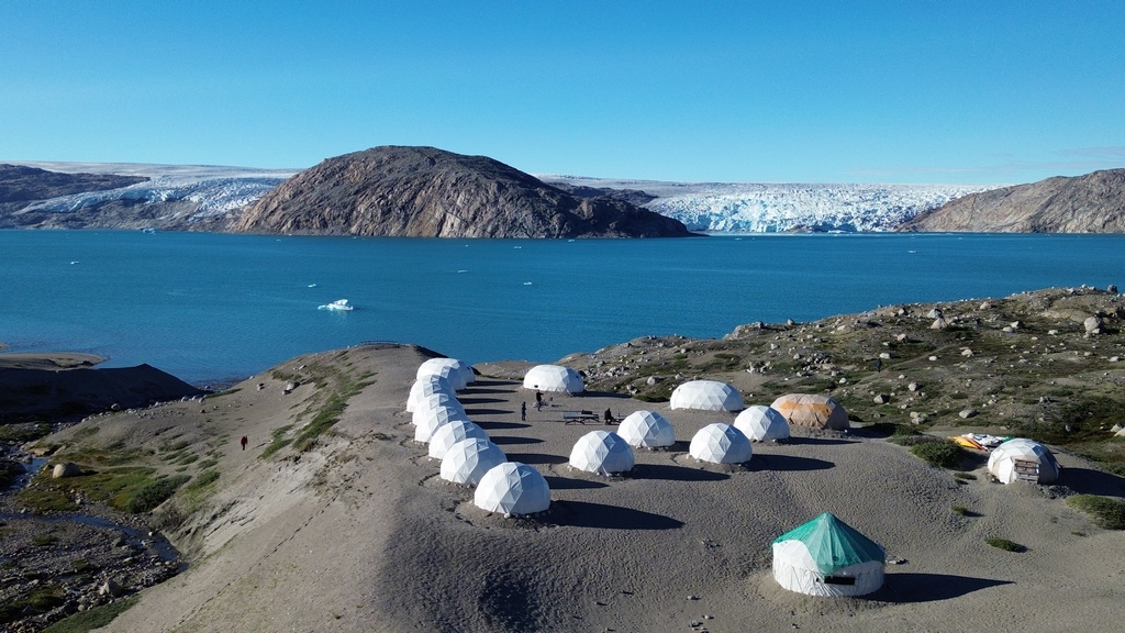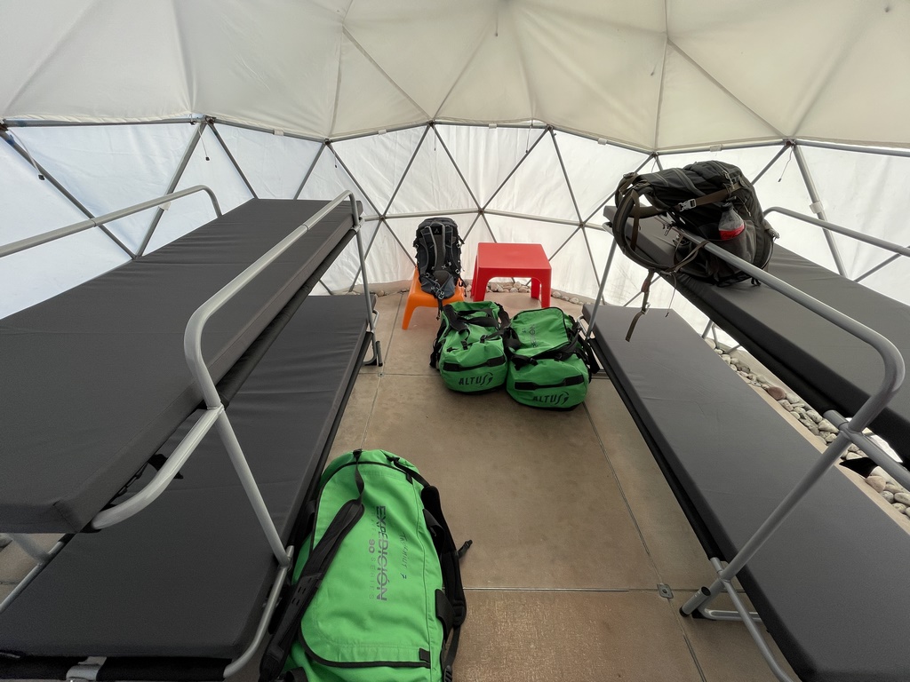 Nach rund zwei Stunden Bootsfahrt kamen wir im Camp an. Jeder Gast hatte sein Gepäck in vom Veranstalter gestellte PVC-Taschen packen müssen, die jedoch nicht wasserdicht waren, sondern nur so aussahen. Hätten wir das gewusst, hätten wir unsere 100% wasserdichten Ortlieb-Taschen mitgebracht. So hatte jeder vom Reiseleiter einen Müllsack bekommen, um die Sachen in den Taschen trocken zu halten… Das Camp lag wunderschön gegenüber eines riesigen Gletschers. Ständig hörte man es grollen und krachen, weil der Gletscher in den Fjord hinein kalbte. Das Camp war ein feststehendes Camp des Veranstalters, in dem die Gäste in sogenannten „Domos“ schliefen, die wie Iglus aussahen: mit LKW-Plane bespannte runde Metallkonstruktionen, in denen Etagenbetten aus Metall standen. Sehr komfortabel: man kann darin stehen und wenn man unter 60kg und unter 1,70m ist, auch gut in den Stockbetten schlafen.