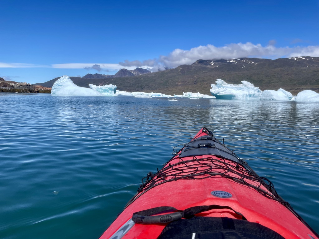 Am ersten Tag liefen wir 5km in die benachbarte Siedlung, wo schon der Kajak-Guide auf uns wartete. Nach dem Morgennebel genossen wir blauen Himmel, der sich im windstillen Fjord spiegelte, auf dem Eisberge schwammen. Wunderschön! Und zwischen diesen Eisbergen gingen wir paddeln. Wir saßen beide noch nie in einem Zweierkajak, kamen aber sofort zurecht und hatten richtig Spaß, zwischen all den „Eiswürfeln“ herumzupaddeln.