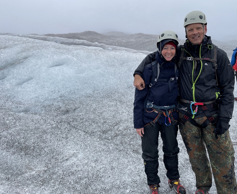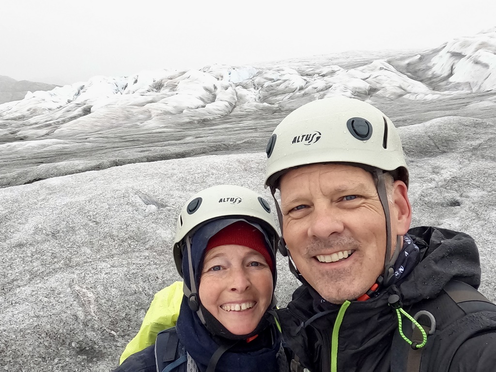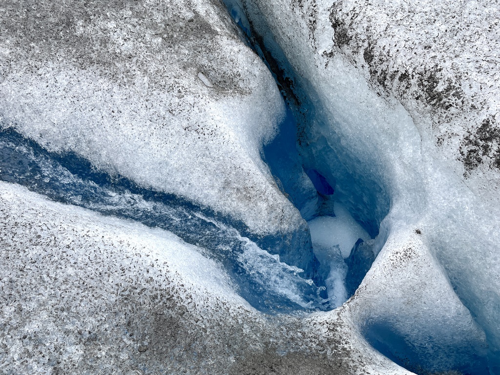 Weil im Regen und Nebel die Konturen verschwammen, es kaum Unterschied zum Grau des Gletschers und des Himmels gab, war die Umgebung fast mystisch. Es knisterte unter unseren Füßen, hier und da plätscherte Schmelzwasser in teils grelltürkisen Wasserwegen über und durch den Gletscher.