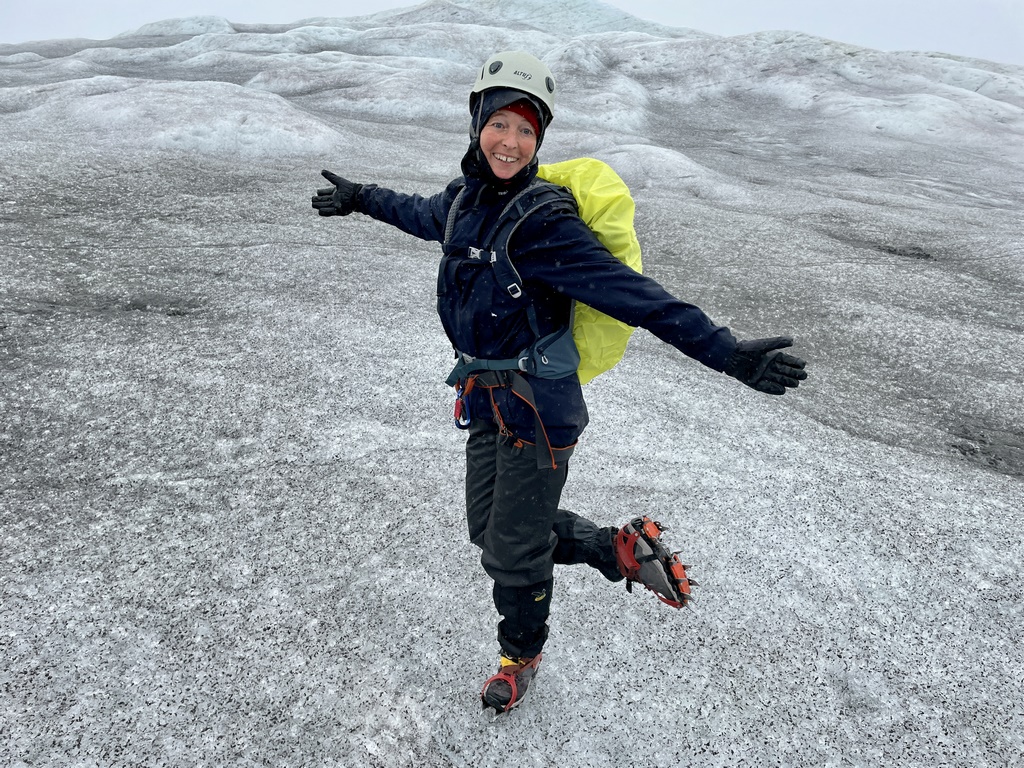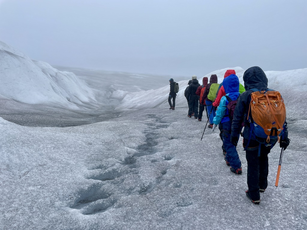 Nach der zweiten Nacht im Camp wurden wir mit dem Boot abgeholt und zum Gletscher gebracht, auf den wir nun schon den dritten Tag schauten – beziehungsweise hätten schauen können, wenn kein Nebel gewesen wäre. Der Gletscherführer verteilte Steigeisen, Klettergurte und Helme und nach einer kurzen Einweisung stapften wir los aufs Eis.