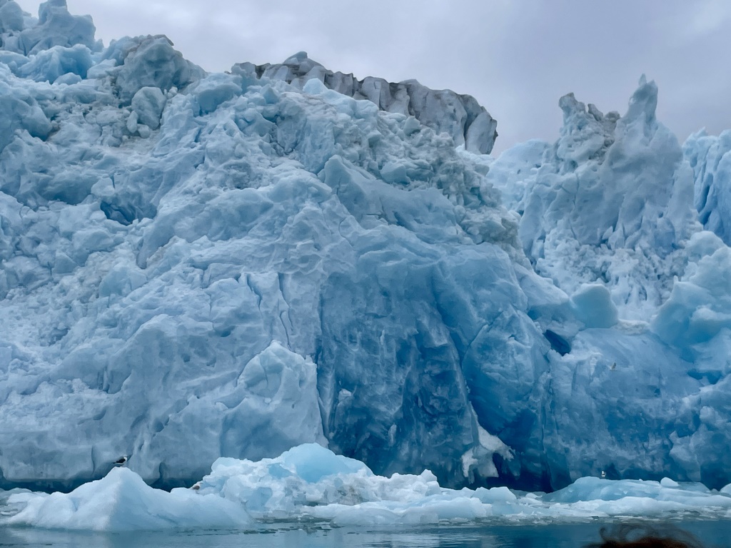 Unser Bootsführer fuhr nah an das Eis heran und wir konnten aus nächster Nähe beobachten, wie der Gletscher kalbte und türkisblaues, Jahrhunderte altes Eis starb. Je komprimierter, luftärmer und somit älter das Eis, desto blauer leuchtet es.