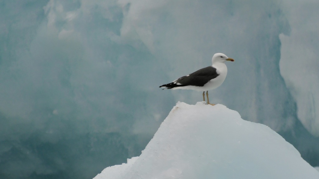 Das Gletschereis zerbricht in Eisberge, Eisschollen und Eiswürfel und überall flattern Vögel – oder surfen auf Eisbrocken in der Strömung und den Strudeln des eisigen Wassers.