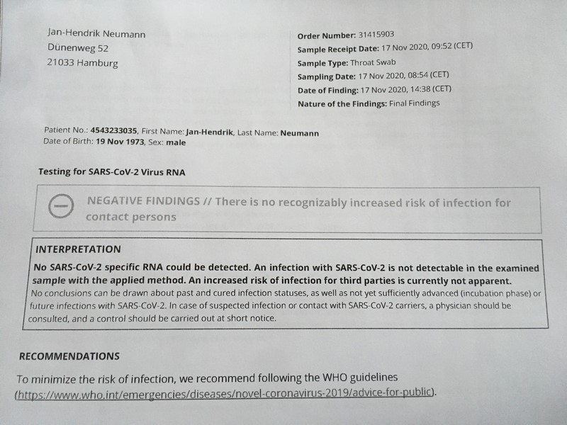 Wir googelten uns die Finger wund und fanden heraus: am Flughafen Frankfurt gibt es ein privates (und ein staatliches) Testzentrum. Im privaten Testzentrum gibt es Testergebnisse innerhalb maximal 24 Stunden, mit Preisaufschlag innerhalb von 12 oder gar nur sechs Stunden. Das war die Lösung, wenn auch illegal, denn 12 Stunden auf ein Testergebnis warten, 600km durch Deutschland fahren, nicht zu übernachten und im 24 Stunden Rahmen aus Deutschland wieder auszureisen war schlichtweg unmöglich. Deutschland hatte nämlich mittlerweile die „digitale Einreiseanmeldung“ verpflichtend gemacht, die jeder vor Einreise nach Deutschland machen muss, damit der Staat die Einhaltung der Regeln auch kontrollieren kann. Theoretisch.