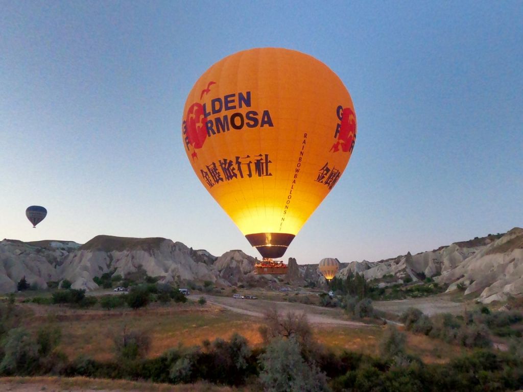 Wir wurden um 4 Uhr abgeholt und auf einen Platz inmitten der Gesteinsformationen gefahren, den wir mit Hans am Vortag schon erkundet hatten. Wir konnten beobachten, wie aus einer langen „Stoffwurst“ ein großer, gelber Ballon wurde, in dessen Weidenkorb (ich hatte Plastik erwartet) wir dann kletterten. Sanft hob der Ballon ab und mit uns bestimmt 80 weitere Ballons rund um uns! Es sah traumhaft aus, wie überall beim Anfeuern leuchtende, bunte Bälle aus den Tälern aufstiegen und Himmel und Landschaft verzauberten.