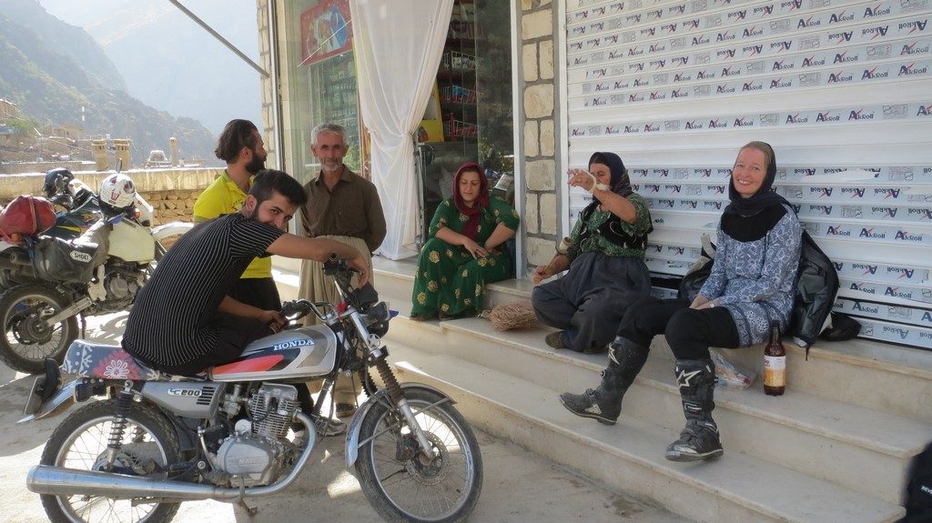 Das Dorf selbst liegt in den Steilhängen eines Tales, etwas versteckt und daher wirklich ziemlich unberührt. Mir war es peinlich, mit dem Motorrad Lärm zu machen, denn das Dorf strahlte Stille aus. So hielten wir am Dorfplatz vor einem Laden, um etwas zu trinken zu kaufen. Als klar war, dass ich eine Frau bin (ich fahre im Iran immer mit dem Zopf unterm Kopftuch), waren alle besonders strahlend: Oma textete mich sofort mit einem riesigen Lächeln im Gesicht zu, alle freuten sich.