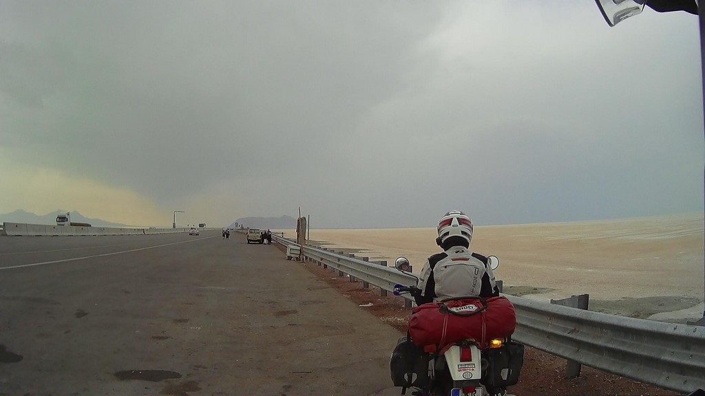 Wir jedoch hatten kein Problem mit Trockenheit. Im Gegenteil. Über dem See braute sich eine dicke, schwarze Regenwand zusammen und wir hofften, noch rechtzeitig eine Unterkunft zu finden. 900m vor der anvisierten Unterkunft standen wir im alltäglichen Verkehrsinfarkt iranischer Städte, als der Himmel seine Schleusen öffnete. Doch wir hatten Glück und bekamen auf Anhieb ein Zimmer, wo wir unsere nassen Sachen trocknen konnten.