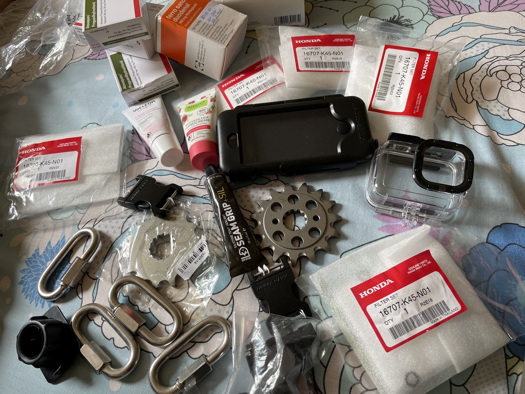 Wir fuhren nicht weit, 50km von unserem „Hideaway“ entfernt wartete unser Päckchen aus Deutschland. Die lieben Kuriere machten Urlaub im 5* Hotel und wir durften nicht mal den Parkplatz betreten. Wir trafen uns auf der Straße davor und bekamen eiskaltes Sprudel(!)wasser aus dem Hotel mitgebracht! Was für eine Wohltat! Die beiden haben so lieb mitgedacht! Das Päckchen war fast wie Weihnachten: Benzinfilter für die Benzinpumpe der Honda, Spiegelhalterungen für die KTM (Jan hatte seit Dezember nur noch einen Spiegel deswegen), Karabiner zur Reparatur von Jans (Enduristan) Gepäcktaschen, für jeden von uns ein neues Ritzel, eine neue Handyladeschale für die Honda, deren über mehrere Kontinente gereiste „alte“ Schale von unbefugten Fummelhänden im Hotelgarten in Nouakschott zerstört wurde, ein paar Medikamente (Danke an Katja!), ein neues Kameragehäuse für die GoPro (das war ja in Mauretanien während der Fahrt weggebrochen), Rucksackschnallen zur Reparatur, eine Tube Nahtdicht und Cremchen. Kleinigkeiten, die wir unterwegs nicht auftreiben konnten.