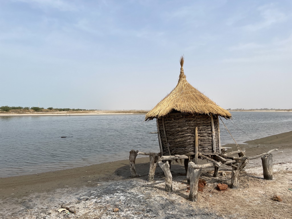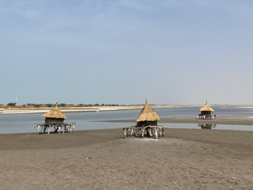 Wir konnten solche Vorratshüttchen auch ohne Bootstour anschauen, denn es war Ebbe, als wir die „Salz Brunnen“ von Palmarin besuchten. Davon hatten wir Luftaufnahmen bei Instagram gesehen und weil Jan eine Drohne hat, wollten wir da auch hin. Für Fußgänger ist es keine wirkliche Sehenswürdigkeit, man braucht schon eine Drohne – oder gleich ein kleines Flugzeug, um es nicht nur auf Fotos, sondern live zu sehen. Im Watt wird dort seit Jahrhunderten in runden Löchern Meerwasser aufgefangen und das Salz auskristallisieren gelassen.