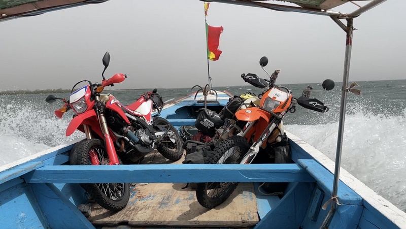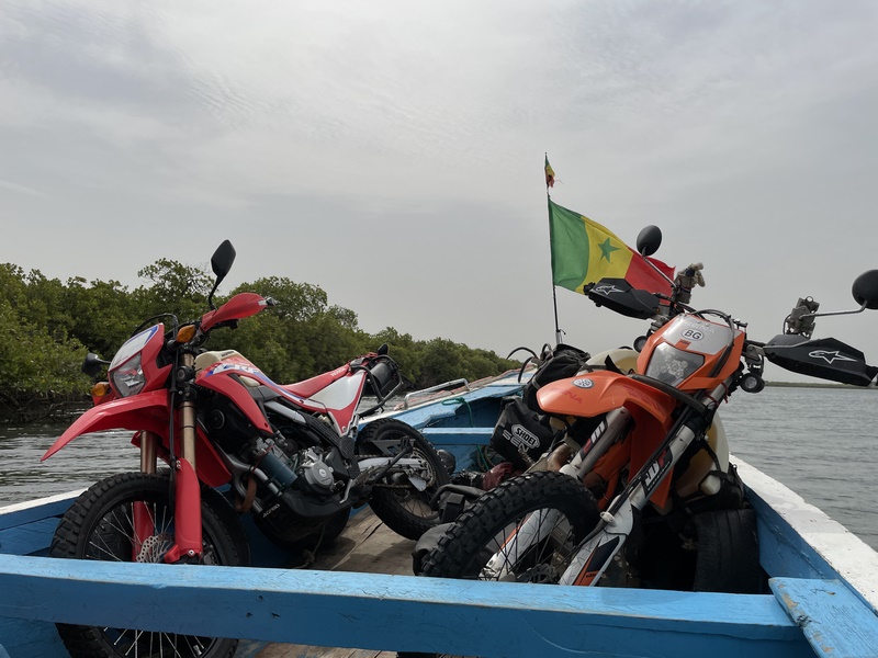 Es wurde noch toller. Das Sine-Saloum Delta steht unter UNESCO Weltnaturerbe Schutz und man kann darin Bootstouren machen. Da wir beide keine Vogelkundler sind, sondern eher größere Tiere wie Delfine oder Manatis sehen möchten, machen für uns Touren durch die allerkleinsten Nebenarme nicht sooo viel Sinn. Das haben wir schon zu Beginn der Reise 2018 im auch unter UNESCO Weltnaturerbe Schutz stehenden Donaudeltas gemacht. Trotzdem wollten wir den Senegal nicht ohne Bootstour im Delta verlassen, aber auch keine klassische Touristentour zu den kleinen Speicherhäuschen mit angeschlossenen Souvenir-Shops machen. Da traf es sich gut, dass wir keine Lust hatten, von dem Haff auf dem wir uns befanden, uns wieder zurück durch die Städte um das Feuchtgebiet herum über 200km Landstraße zu quälen. Warum nicht einfach ein Boot nehmen, die Motorräder draufstellen und Bootsausflug und Weiterreise kombinieren?