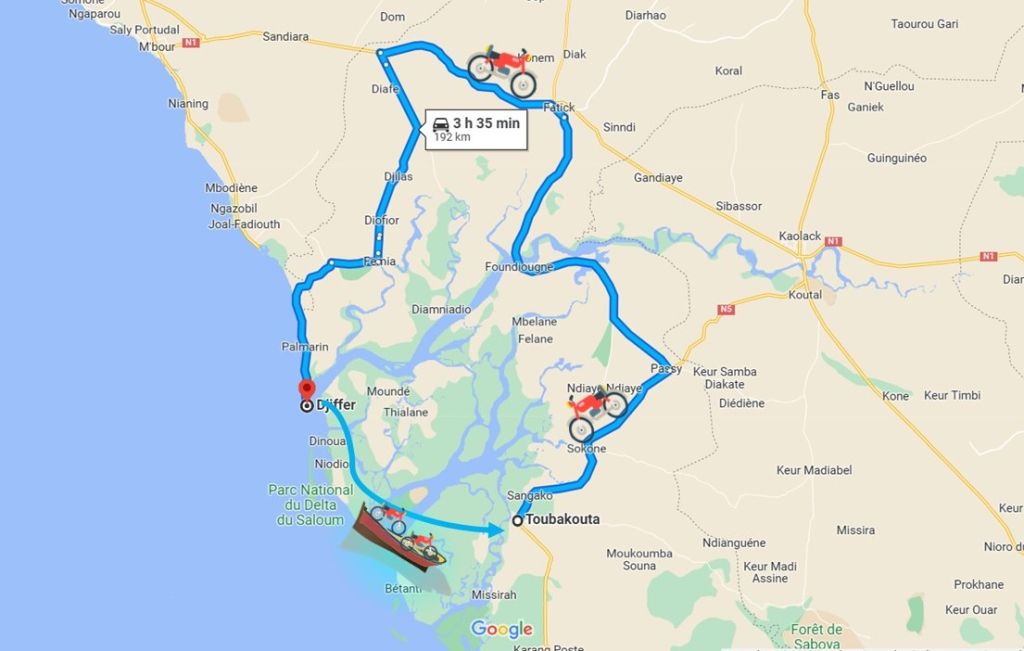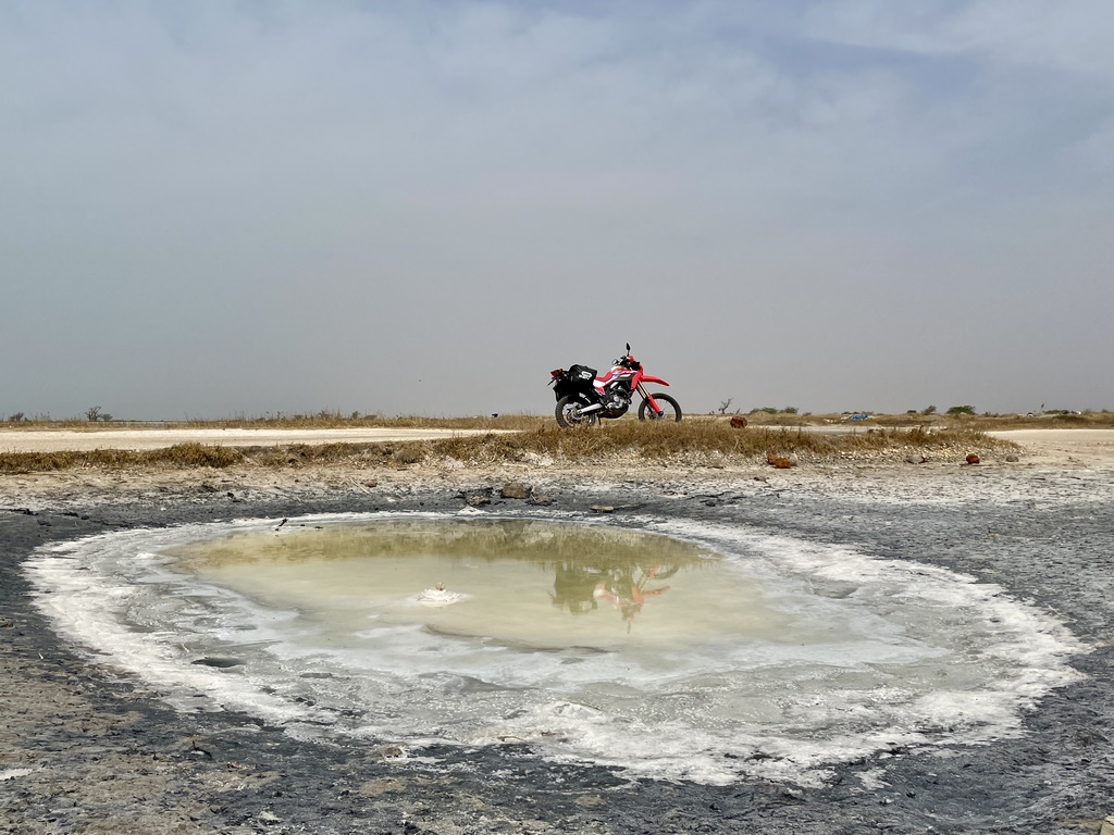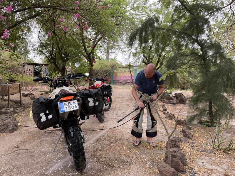 Nach 3,5 Stunden manchmal ziemlich wilder Fahrt waren wir angekommen. In Toubacouta gibt es sogar eine Art Mole, auf die man die Motorräder schnell heben konnte. Sehr praktisch! Wir sattelten wieder auf und orientierten uns. Eine Ortschaft von der Seeseite ohne Hafen aus zu erreichen war neu für uns. Ein Belgier vermietet Zimmer im Ort und hatte sogar einen Kärcher, mit dem wir die dicken Salzkrusten von unseren Motorrädern waschen konnten. Besser konnten wir es nicht treffen! Auch, wenn es etwas gedauert hat, bis er verstand, warum unsere Motorräder und wir salzgepökelt waren.