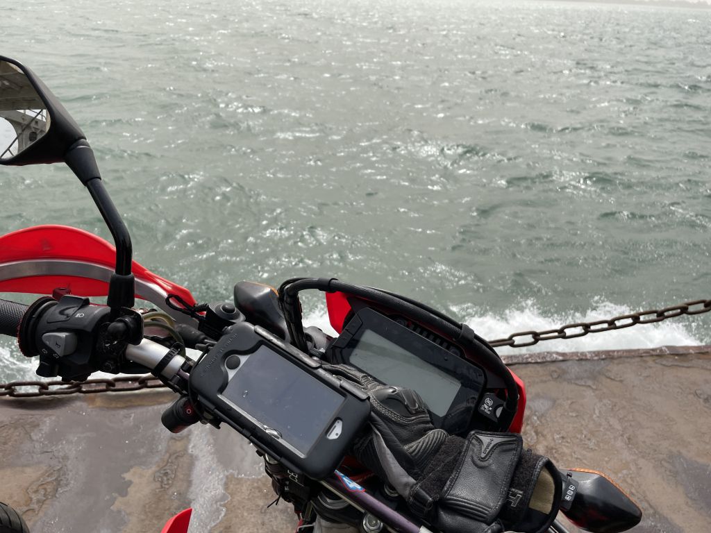 Wir hatten gelesen, dass es von den Briten eine Reisewarnung für genau diese Fähre gäbe. Sie sei ständig völlig überladen, bliebe oft in der Mitte der Überfahrt mit Motorschaden oder Stromausfall liegen und laufe auch schonmal auf Grund. Das mit dem „Überladen“ ist wahrscheinlich wahr, der Rest lief unkompliziert. Wir Motorradfahrer standen direkt vorne an der Ladekante und wurden mit jeder Welle geduscht. Und dabei hatten wir gerade unsere Motorräder entsalzt!