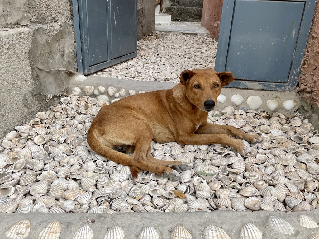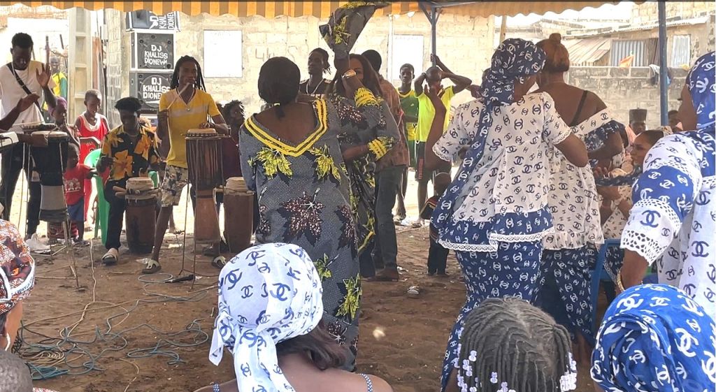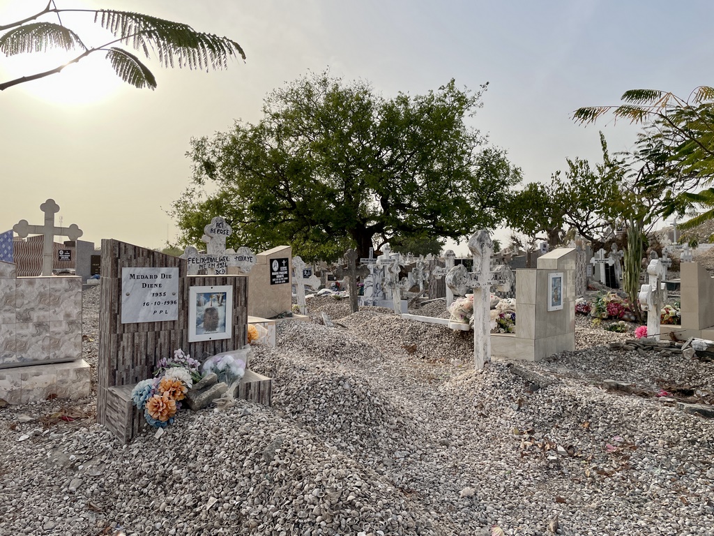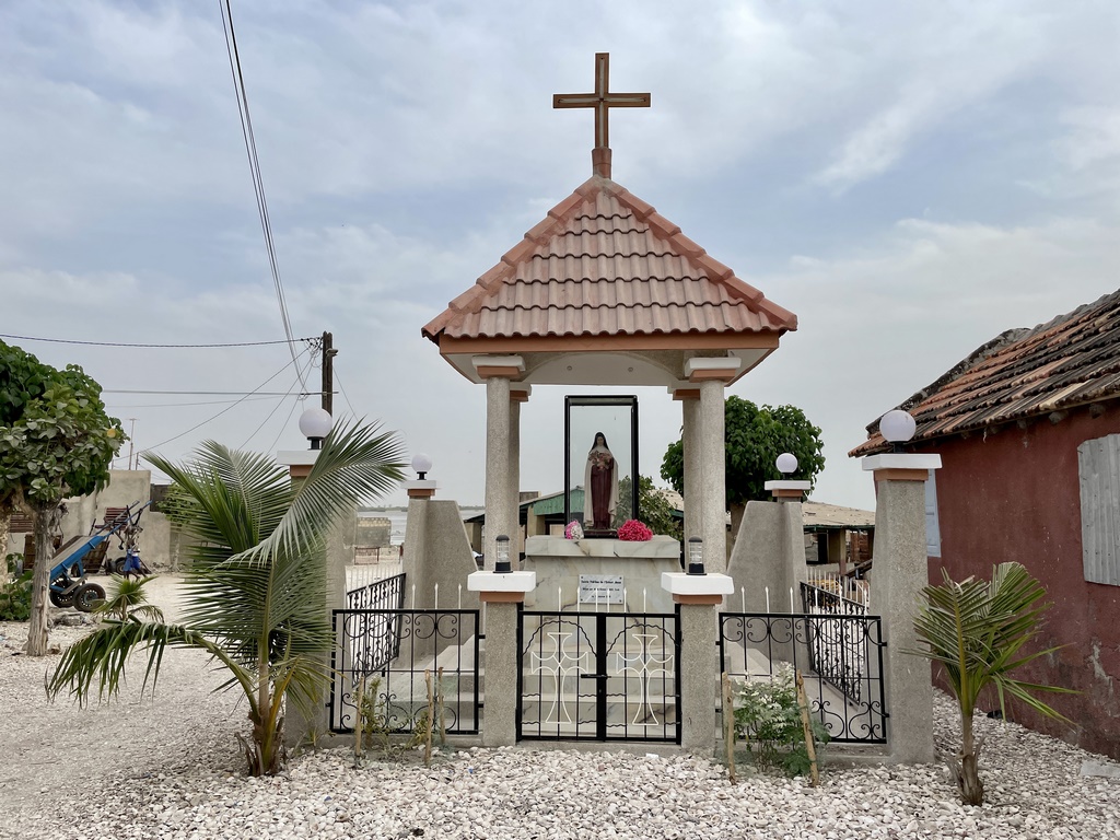 Es gibt gleich daneben eine „Friedhofsinsel“ namens Diotyo, die ähnlich „dicht besiedelt“ ist und auf der Christen und Muslime gemeinsam beerdigt (oder muss man da „bemuschelt“ sagen?) werden. Die Bewohner der Insel(n) und des Deltas, die Serer, sind hauptsächlich Christen, weswegen wir hier zum ersten Mal in Westafrika Schweine herumlaufen sahen und es auf dem Friedhof Kreuze gibt. Seit Langem hörten wir wieder Kirchenglocken! Am Wochenende unseres Besuchs war gerade riesiges Kirchenfest zu Ehren der Jungfrau von Lourdes. Die Menschen sangen und klatschten in bunter Festtagskleidung im Gottesdienst und auf den Gassen gab es Musik (hier immer so laut, dass das Trommelfell fast platzt) und alle haben getanzt. Nur zu Essen gab es nichts. Kein Streetfood und alle bis auf ein Restaurant (welches uns dann ein freundlicher Inselbewohner zeigte) geschlossen, weil man entweder selbst feiern war oder sowieso nur Mittagstisch für die Ausflügler aus den Hotelresorts anbietet. Wir sind fast verhungert! 😊