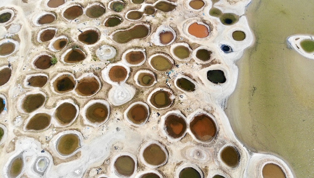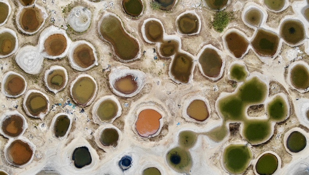 Je nach Alge, die in einem solchen „Loch“ in der Salzlauge wächst, schillern die kreisrunden „Salzbrunnen“ in bunten Farben: grün, rot, blau, braun, gelb,… Jan hat mit der Drohne viele Fotos aus der Vogelperspektive geschossen, ich als Fußgänger konnte nur wenig sehen. Der Marschboden ist unglaublich matschig und ein falscher Schritt und man steckt mit den Stiefeln tief im sandigen Matsch. Woher ich das weiß? Ich wollte Fotos von Salzkristallen. 😊