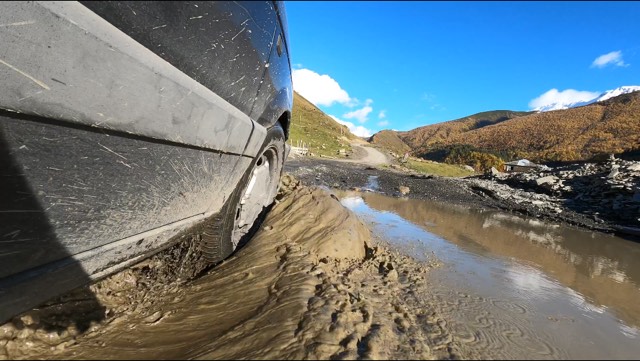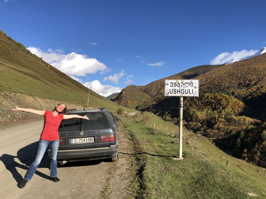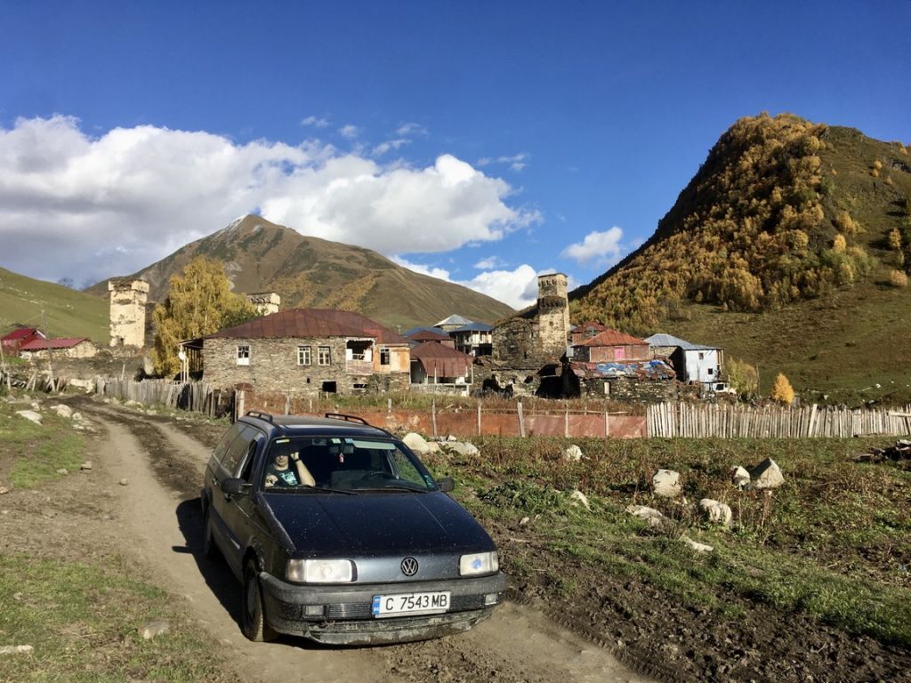 Natürlich waren wir vor drei Jahren schon dort (hier könnt Ihr das nachlesen: Im Land der Wehrtürme) und waren nur in die Richtung gefahren, um die Landschaft in tollsten Herbstfarben bei Kaiserwetter zu genießen. Wir mussten daher eigentlich nicht auch noch ins sagenumwobene, UNESCO Weltkulturerbe Ushguli. Das Dorf am Ende einer ewig schlammigen Bergpiste, über die sich Heldengeschichten angeblich waghalsiger Reisender ranken. Das Dorf, das so manchen Reiseführer ziert, weil es besonders viele der für Swanetien typischen Wehrtürme hat. Das Dorf, zu dem man, glaubt man den heldenhaften Reisenden oder den Einheimischen mit Fahrservice, nur mit Allrad im Geländewagen kommt. Stichwort „tischkantentiefe Pfützen“…