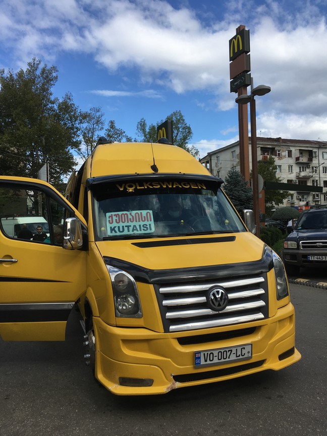Kleiner Schönheitsfehler: der Schlüssel zu Halle wanderte gerade in einer Hosentasche des Besitzers durch die Karpaten, der Ersatzschlüssel lag in Batumi. Bis der Zweitschlüssel per Bus in Kutaisi am Busbahnhof ankam, trafen wir uns mit Jenni und Flo vom „Katastrophenschutzbus„, die ich letztes Jahr in Bulgarien schon kennengelernt hatte und mit denen wir in regem Austausch über Instagram stehen. Wir tranken zusammen Kaffee in ihrem fahrenden Zuhause. Dann rollte der gelbe VW Bus aus Batumi auf den Busbahnhof, der Busfahrer händigte uns den Schlüssel aus und wir konnten Hans und Oskar wieder abholen.