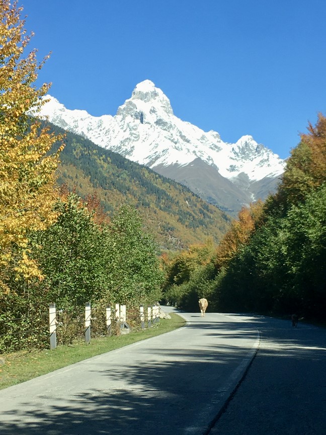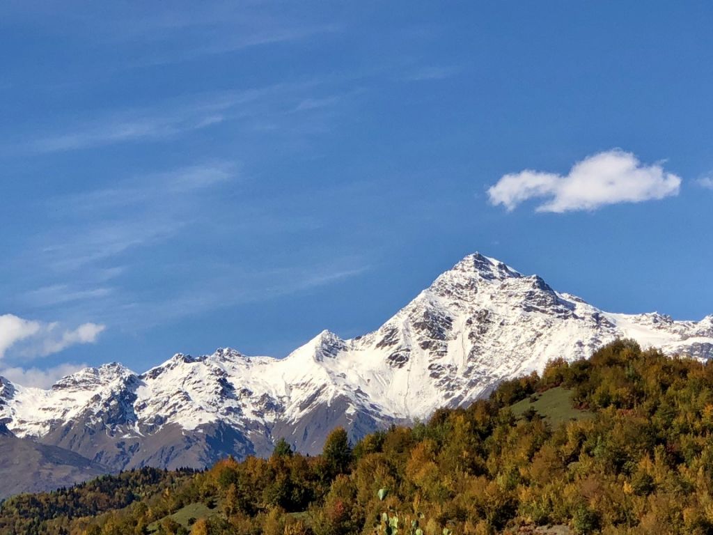 Das Wetter war richtig toll: blauer Himmel, Sonnenschein und frisch weiß gezuckerte Bergketten! Während wir in Russland waren, hatte es im Kaukasus den ersten Schnee gegeben und die Berge zogen uns magisch an. Was konnte es Schöneres geben als weißer Schnee vor blauem Himmel und herbstbunten Wäldern! Also nächste Planänderung: auf in die Berge! Wir ließen Oskar „beim Büffelbaby“ stehen und fuhren Richtung Mestia.