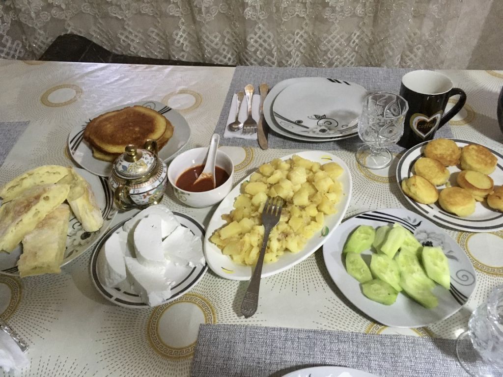 Wir hatten immer noch Schlafbedürfnis und verbrachten eine lange, herrlich erfrischende Nacht und genossen am Morgen das Frühstück der Familie, das „Hungerprobleme in Afrika lösen könnte“, weil es so reichhaltig ist. Das, was man an Köstlichkeiten vom eigenen Hof (hausgemachte Butter, frische Milch und eigener Käse) nicht schafft, „muss“ man in Brotbeutel als Wegzehrung einpacken. Wahnsinn! Und da saßen wir dann 11km Luftlinie von Russland entfernt in der Sonne, guckten auf schneebedeckte Berge und Wehrtürme und da fiel uns ein: unser Plan war ja eigentlich nicht die russische, sondern die türkische Grenze! Aber so ist das mit uns und den Plänen. Unser Ausflug in die Berge war Seelenbalsam pur!