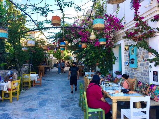 Aber selbst auf der als „von Massentourismus verseucht“ verschrienen Bodrum Halbinsel fanden wir ein Örtchen, in dem wir uns vorstellen könnten, den „nächsten Lockdown“ auszusitzen, falls wir dann gerade in der Nähe sein sollten: Gümüslük! Eine kleine Bucht, die so schmal ist, dass die Cafés und Restaurants ihre Tische direkt ans Wasser in den Sand stellen. Bei steigender Tide bekommt man halt nasse Füße, aber genau das macht das Flair des Örtchens aus: bunt, entspannt, etwas Alt-Hippie und voll netter Ecken zum Kaffeetrinken oder Fischessen.