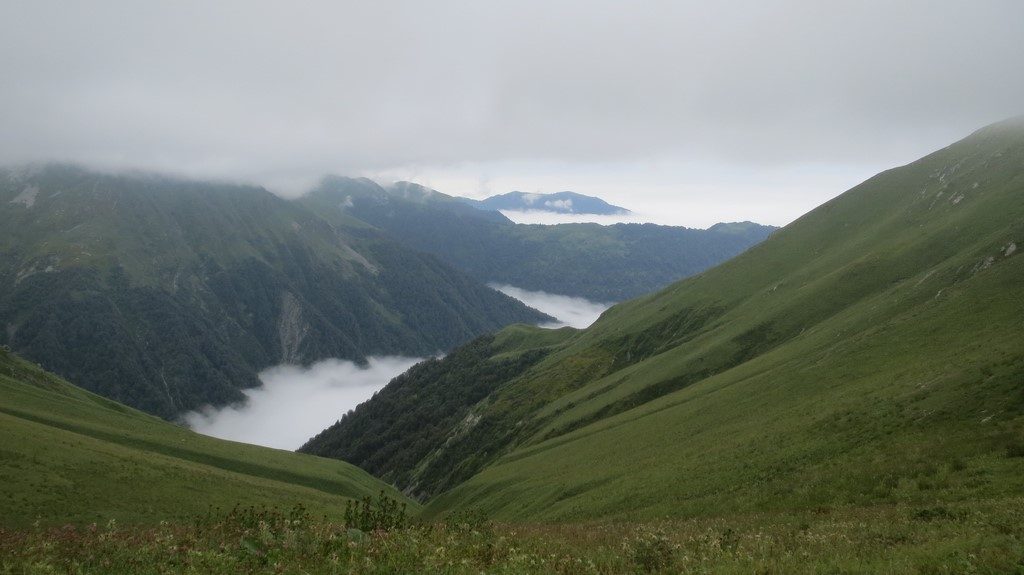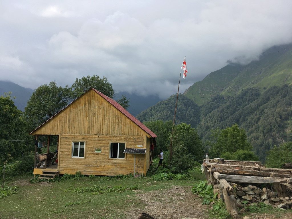 Am späten Nachmittag hatten wir 1500 Höhenmeter bezwungen und kamen in der ersten Schutzhütte an. Eigentlich hatten wir Zeltübernachtung bezahlt, aber der Hüttenwirt bestand darauf, dass wir in der Hütte schliefen. Ohne Aufpreis, denn es sei schlimmer Regen angesagt. Die Hütte selbst war sehr spartanisch, der einzige Tisch stand draußen im Nebel, Wasser gab es in 300m Entfernung in Eiswürfelqualität aus einer Quelle. Das Plumpsklo war schon länger nicht mehr „versorgt“ worden. Außer uns waren noch zwei holländische Paare und ein georgisches Pärchen auf der Strecke unterwegs. Wir waren die einzigen, die Pferde für das Gepäck gemietet hatten und die Holländer waren ganz schön neidisch auf uns. Ein Pferd kostet übrigens 16€ pro Tag, man kann also auch am falschen Ende sparen…