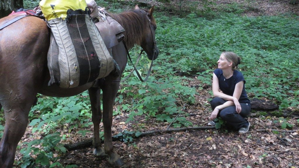 Wir mussten einen Fluss queren und die Stute unseres Guides rutschte auf den runden, handballgroßen Steinen aus und lag im Wasser. Sie tat mir so leid, aber es schien sie nicht groß zu stören, denn sie lief danach weiter, als passiere ihr das öfter. Im Laufe des Trekkings stürzte sie noch weitere 2 Mal, denn das Gelände war teils eher für Steinböcke und Ziegen als für Pferde gemacht. Wir ritten durch urwaldähnlichen, unberührten Wald bergauf und staunten darüber, wie schön Wald sein kann, wenn kein Förster darin herum wirtschaftet und man die Natur sich selbst überlässt.