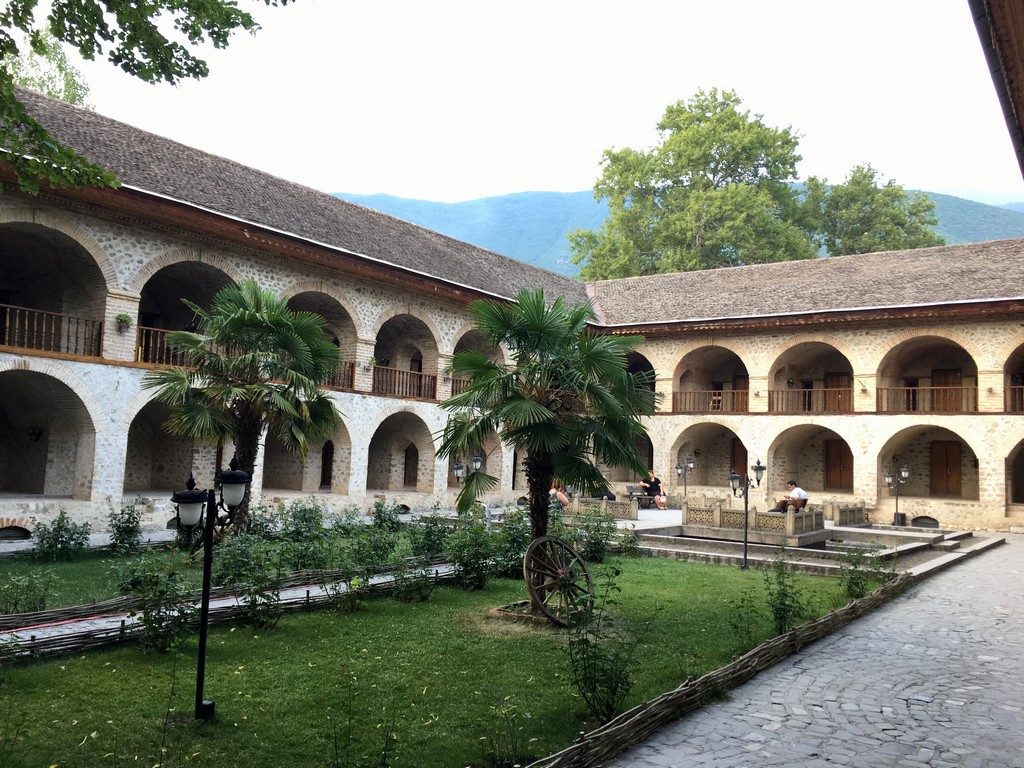 Aber wir waren ja nicht zum Schlemmen in Sheki, sondern wegen der Karawanserei, die wir abends ganz für uns hatten und wegen des Palastes, den wir trotz der riesigen Menschenmassen ganz für uns alleine hatten! Man kommt nämlich nur zu einem persönlichen Termin in das Innere, kann dabei zwischen Guide und Gruppe wählen. Wir wählten Guide und so stiefelten wir mit einem älteren Herrn von Raum zu Raum. Die einzelnen Guides achteten darauf, dass immer nur eine Gruppe im Raum war, sodass die Illusion entstand, den Palast ganz allein zu entdecken. Leider durfte man nicht fotografieren, die Wände sind mit Fresken bemalt, mit Holzschnitzereien verkleidet und die bunten Fenster geben so ein schönes, warmes Licht…