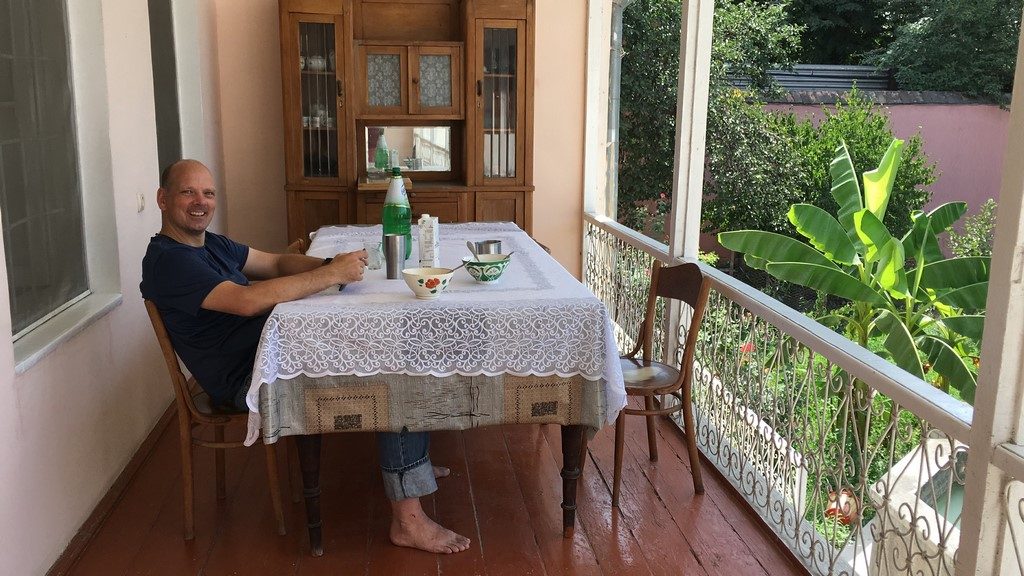 Unser Ziel war Lagodheki, nur 5km von Aserbaidschan entfernt. Wir fanden ein Paradies als Unterkunft: ein älteres Ehepaar vermietet in seinem wunderschönen Haus in einem wunderschönen Garten liebevoll gestaltete Zimmer und die Dame des Hauses kocht so wunderbar zum Frühstück und Abendessen, dass man dort nie mehr weg kann. Zunächst nicht, weil alles so toll ist und dann, weil man so viel gegessen hat, dass man sich nicht mehr bewegen kann.