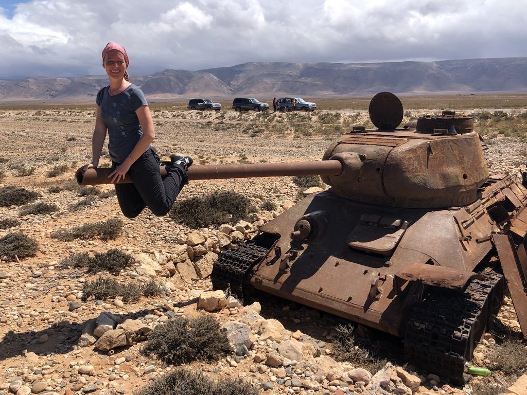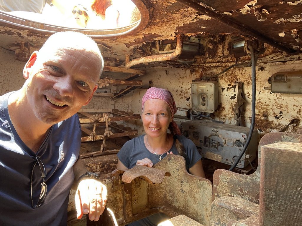 Jan und ich stiegen durch die Luke in den Panzer ein und alle kletterten auf dem alten Kriegsgerät herum. Fast alle. Den Franzosen mussten wir ganz schön überreden, sich zumindest für ein Gruppenfoto zu uns zu gesellen. Ein komischer Kauz, Psychiater von Beruf und alle Klischees erfüllend. Nicht einfach, aber Gott sei Dank der einzige schräge Vogel der Gruppe, die bis dahin zu einem lustigen Haufen zusammengewachsen war.