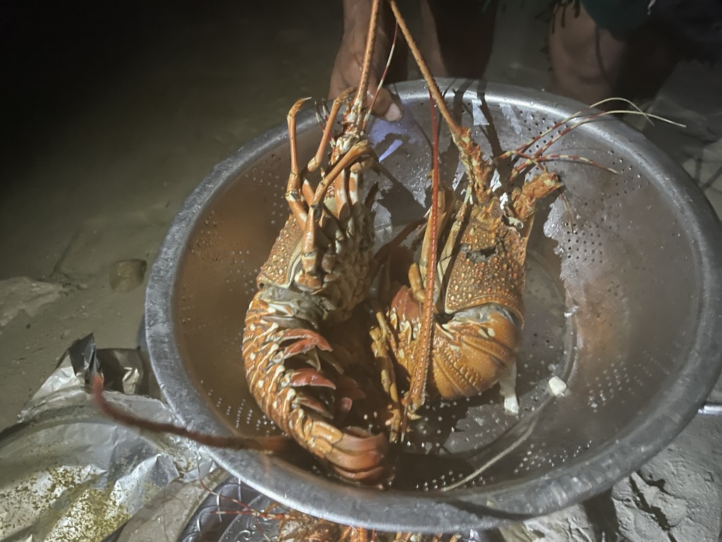 Wir schlugen an einem Strand unser Nachtlager auf, an dem ein Bach von den Bergen in die Arabische See fließt. Die Küchencrew verwöhnte uns mit frischem Popcorn und wir genossen Camping mit Lagerfeuer am grellweißen Strand, doch das war nicht alles: die Crew zauberte aus dem riesigen Topf, in dem es auf dem Lagerfeuer köchelte, riesige Lobster heraus! Wow! Lobster am Strand vom Lagerfeuer essen – absolut genial! Und weil Lobster hier nicht wirklich besonders ist, gibt’s auch kein „Werkzeug“, um das Fleisch auch aus den Beinen zu knacken. Man isst den Schwanz (und der ist so groß, dass er völlig reicht!), dann wirft man den Rest weg. Dekadent für uns „Westler“, absolut normal für Menschen, die damit aufwachsen, dass ein Lobster wie Fisch täglich vor der Haustür vorbei „schwimmt“.