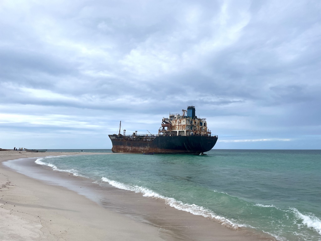 Wir checkten kurz im Hotel ein (immerhin war die Bettwäsche sauber, das Bad dagegen war unter aller Sau), dann ging’s mit drei Toyota Landcruisern an einen Strand zum Mittagessen. Es gab frischen Fisch und leckeren Gewürzreis mit Nelken und Zimt, wir liefen zu einem Schiffswrack und beschnupperten uns gegenseitig. Bis auf den Franzosen alles sehr angenehme Mitreisende, allesamt weit gereist und weltoffen, jedoch waren wir und Reiseleiterin Gina die einzigen, die normalerweise ohne Gruppe zu solchen Zielen reisen.
