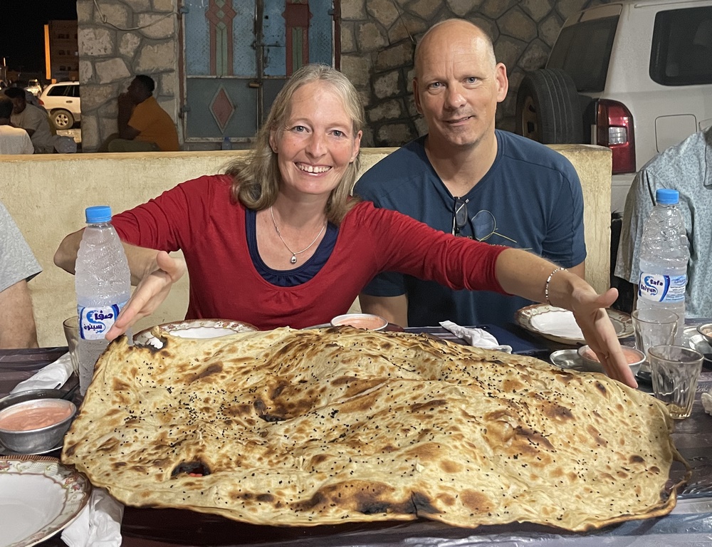 Zum Abendessen ging’s in ein einfaches lokales Restaurant (auf Socotra ist alles extrem einfach, da es fast keine Touristen gibt und sich das Land dank Bürgerkrieg in einer extrem schwierigen Lage befindet), wo wir frisch gebackenes Brot mit Tomatendip, Bohnen und Linsen schlemmten. Einfach, aber extrem lecker! Ich glaube, wir haben uns alle ein wenig überfressen und kugelten uns satt und hundemüde ins Bett.