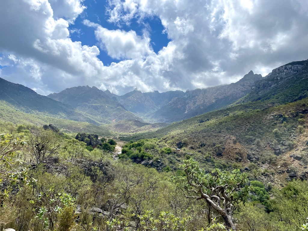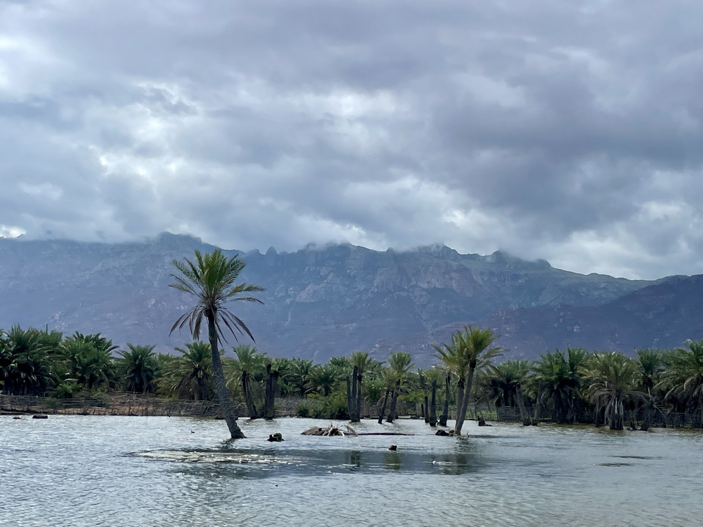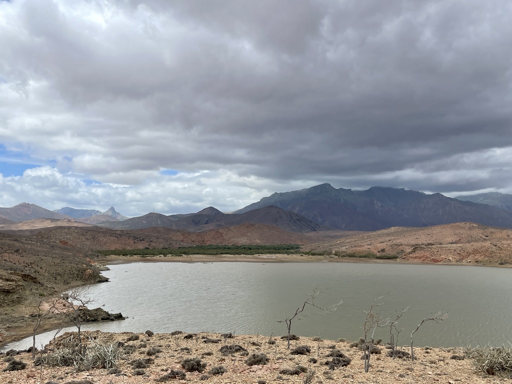 Reiseleiterin Gina hatte uns das Ziel der ersten Wanderung als „natürlicher Infinity-Pool“ und mit einem Foto ihrer ersten Socotra-Reise schmackhaft gemacht: ein natürlicher Pool am Ende eines Tals an einer Bergkante mit Blick von der Klippe hinter bis hin zur Arabischen See. Bloß als wir am Ende des Tals ankamen, stellten wir fest, dass in der Zwischenzeit der Regen einen Haufen Kies auf der Kante aufgetürmt hatte und der Pool nur zur Hälfte mit nicht sehr einladendem Wasser gefüllt war. Dann fing es auch noch an, zu regnen und wir traten recht zügig den rutschigen Rückweg an, auf dem sich die Mexikanerin eine unfreiwillige Rutschpartie gönnte und die Britin eine Blase lief. Das fing ja gut an!