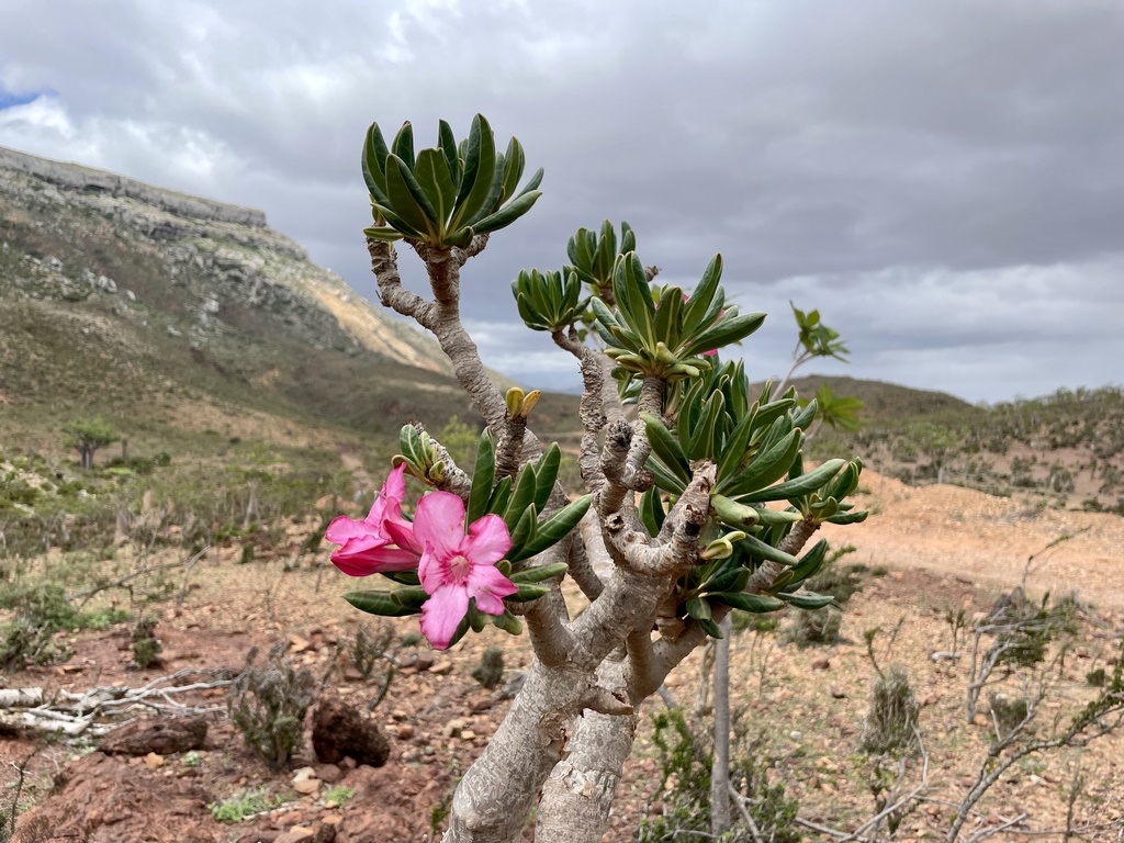 Die „Wüstenrose“ blüht eigentlich im Frühjahr, unser Fahrer hatte aber ein gutes Auge und erspähte für uns eine einzige Pflanze, die jetzt schon (oder noch?) rosa blühte. Wunderschön in der sonst recht kargen Landschaft!