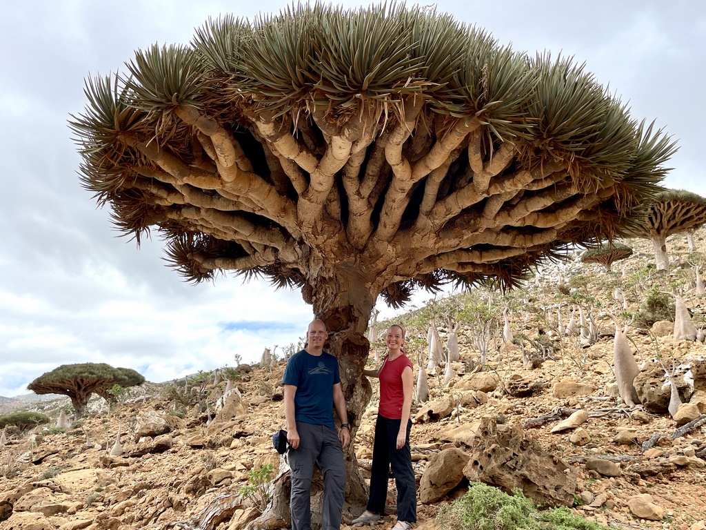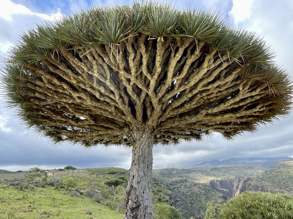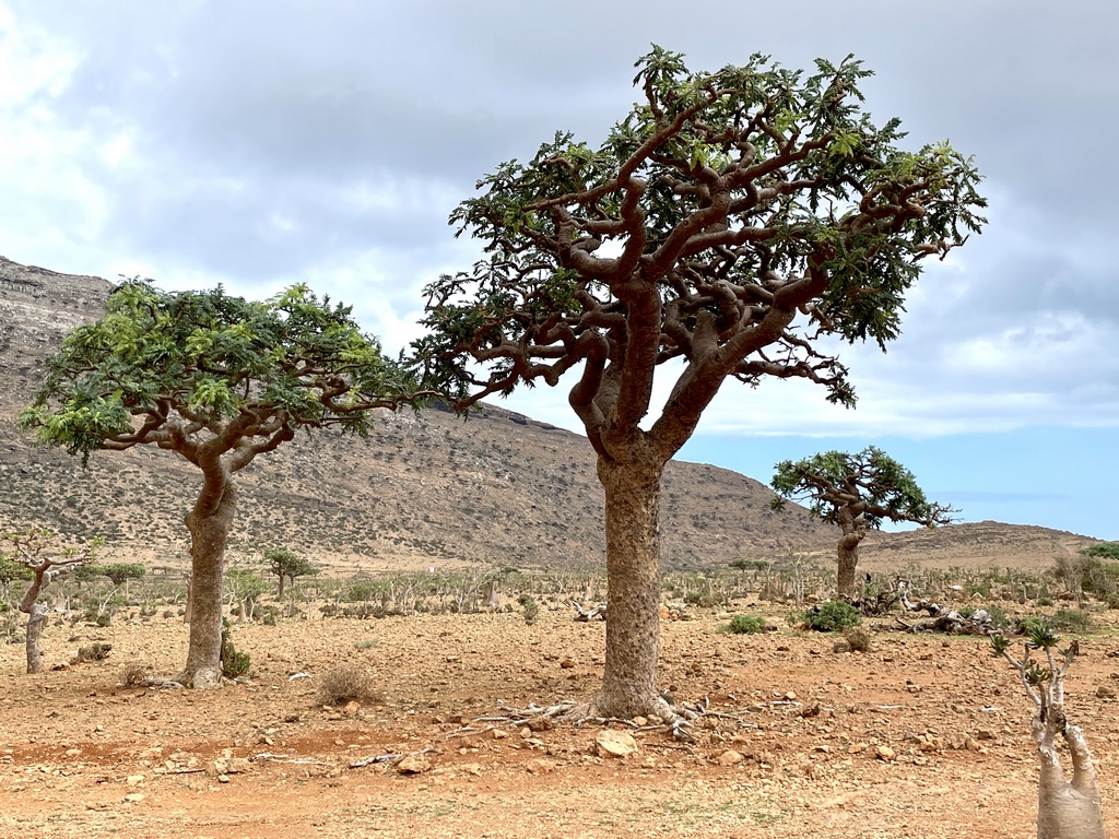 Auf dem Homhil Plateau wachsen Weihrauchbäume, Wüstenrosen, Flaschenbäume und die endemischen Drachenblutbäume, für die Socotra bekannt ist. Ihre Zweige breiten sich zu einem pilzförmigen Dach aus und wenn man die Rinde anritzt, tritt eine dunkelrote Flüssigkeit, das „Drachenblut“ aus. Das Drachenblut kristallisiert ähnlich wie Weihrauch zu kleinen Kristallen aus (tiefdunkelrot), welche früher zum Färben genutzt wurden, heute aber nur noch als Pulver fein gemahlen von den Frauen als Rouge oder Lippenrot genutzt werden. Angeblich, denn weil der Jemen sehr islamisch ist, sind alle Frauen komplett schwarz verschleiert und man sieht nur ihre wunderschönen (meist stark geschminkten) Augen.